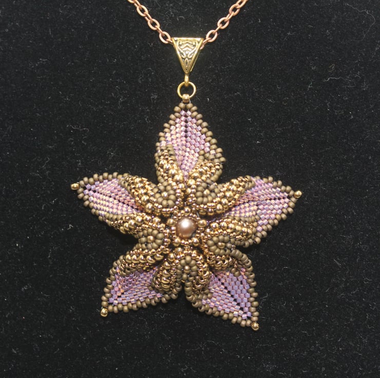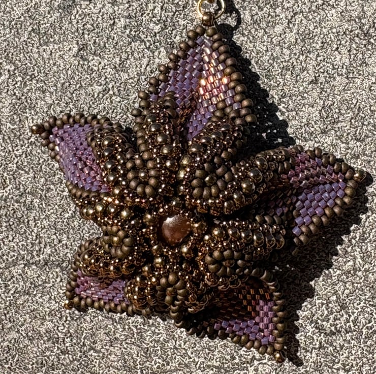 This is definitely a statement piece of jewellery. I loved the challenge of the intricate pattern and how beads can be manipulated into a 3d design. I chose brown and bronzes on this occasion although I have made it in blue and red before.