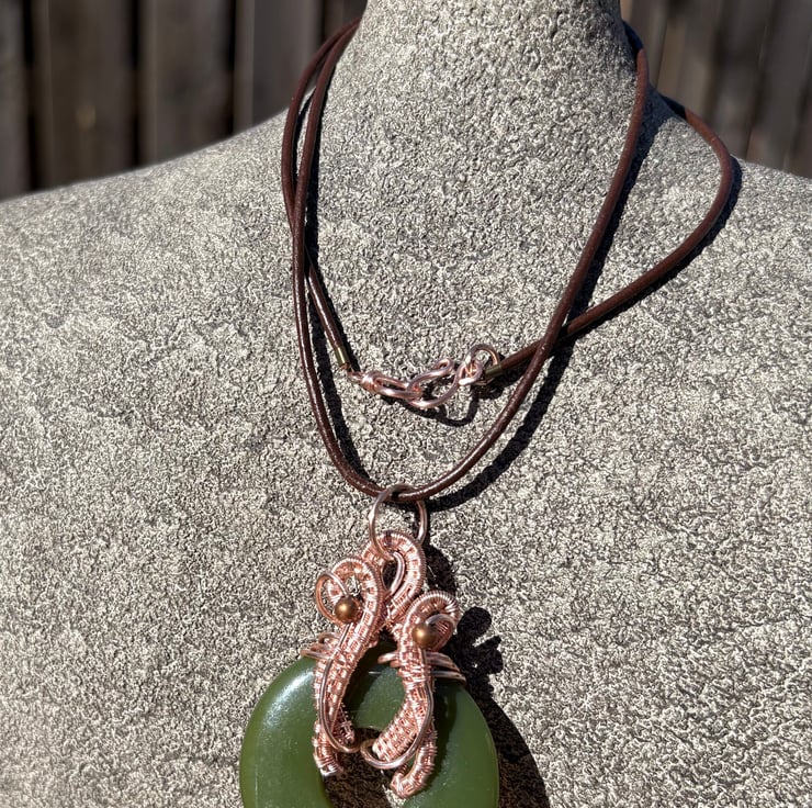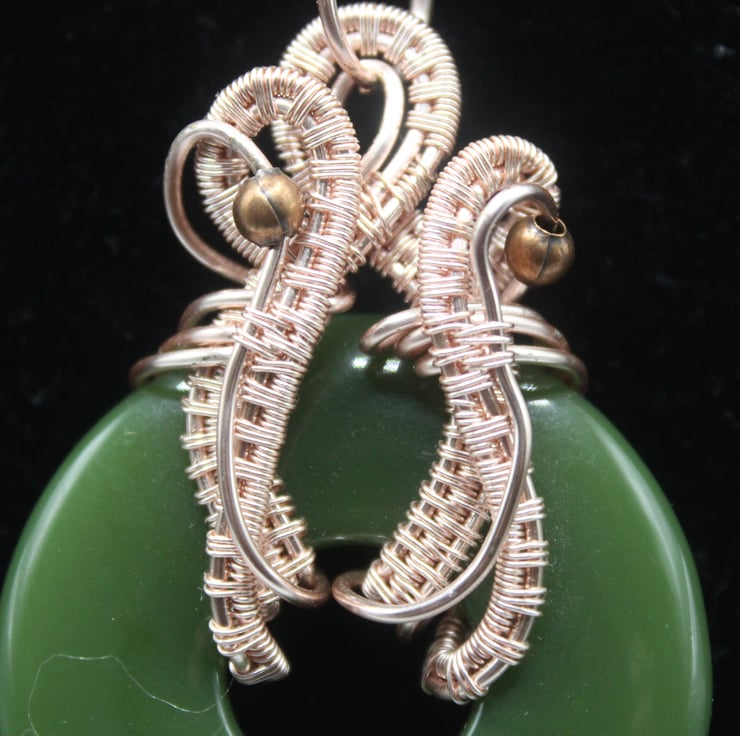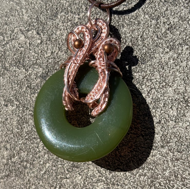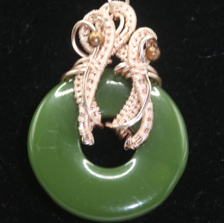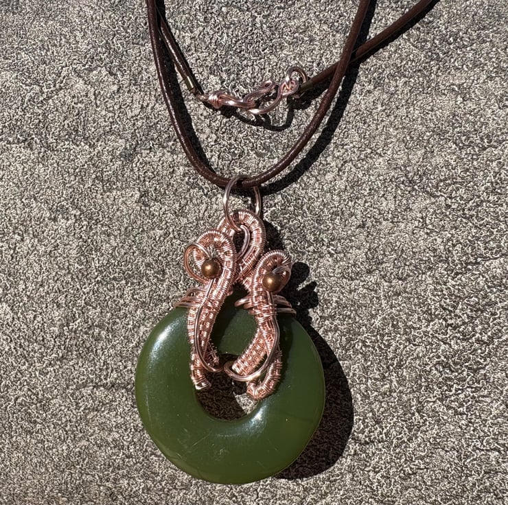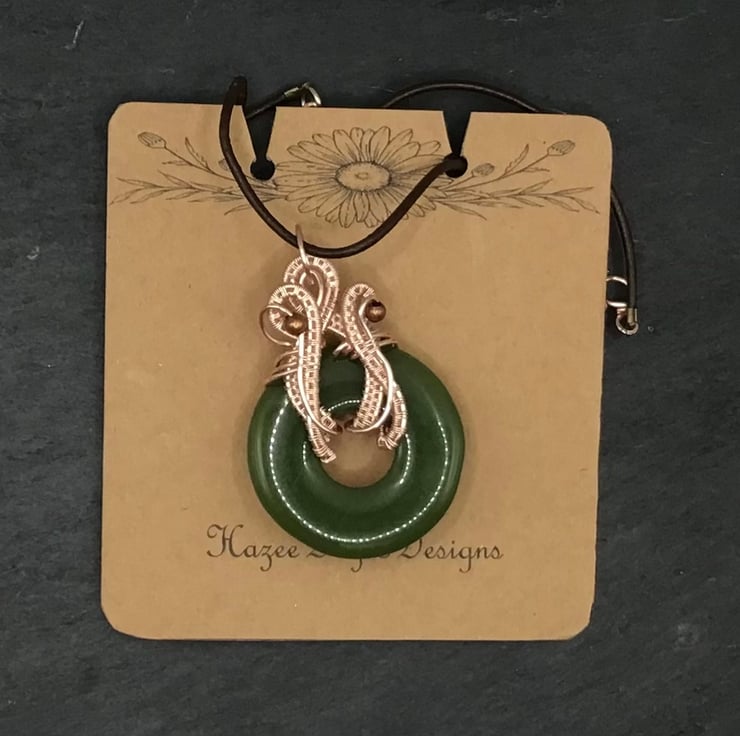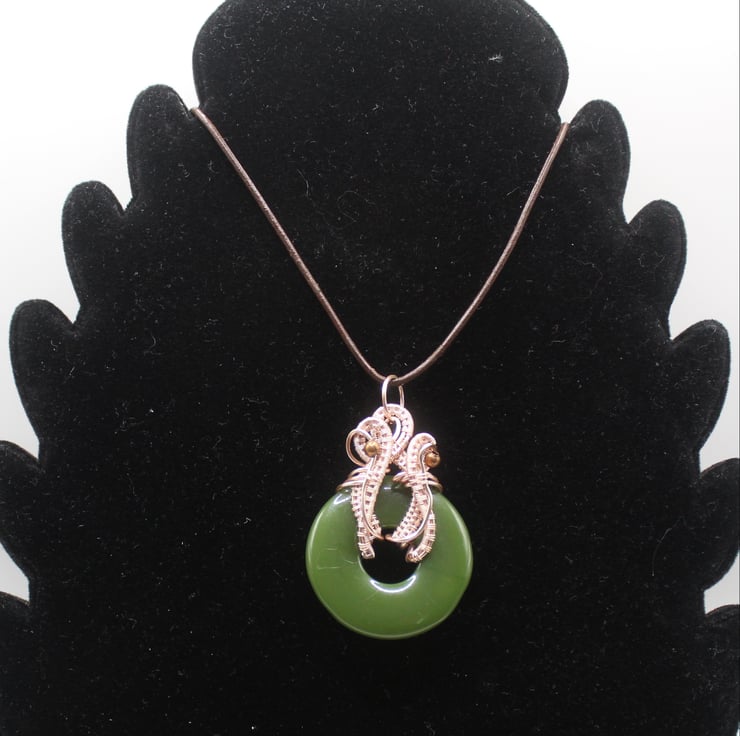 A striking wire wrapped jade green donut pendant. The wire used is rose gold coloured copper wire in an intricate design with 2 copper coloured beads to accentuate the design. It measures approx. 4 x 7 cms and comes with a brown cord measuring approx 50 cm with a handmade clasp.