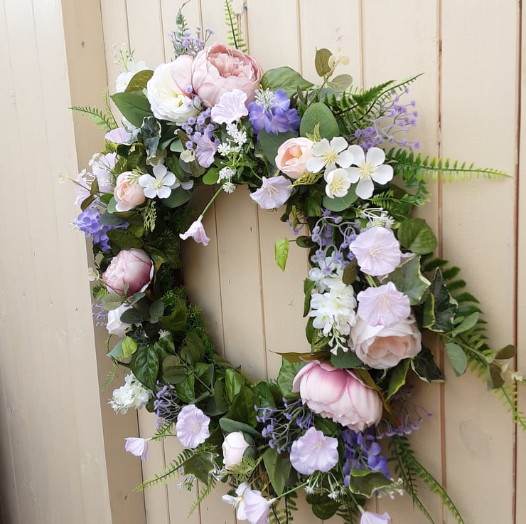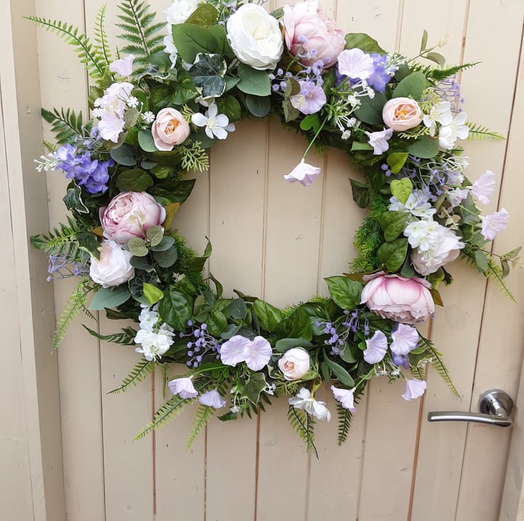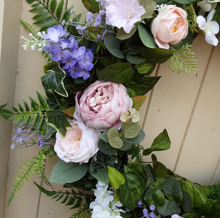 Large 56cm wreath. Pail pink peonies, roses and begonia, white wisteria and white green and purple foliage.
