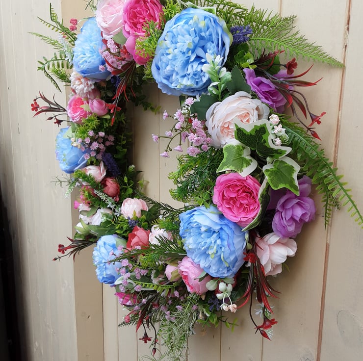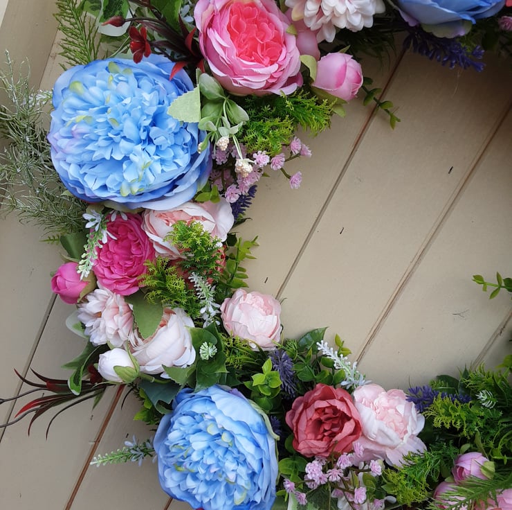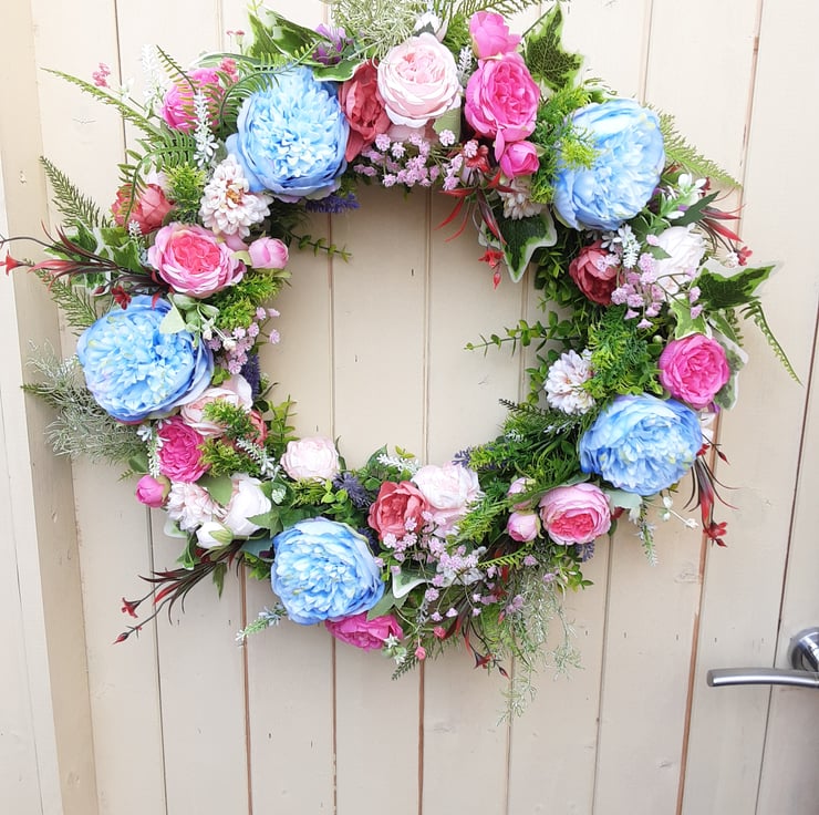46cm large wreath. Baby blue, pink's peonies, pink roses, baby pink dahlias, cream roses, green and red foliage.