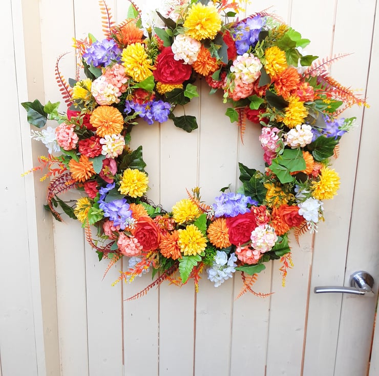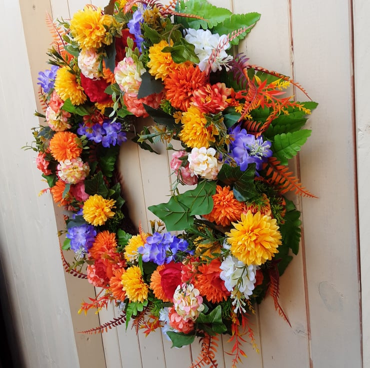 65cm wreath, red coral ,orange peonies, yellow orange dahlias, multi coloured hydrangeas, white, purple wisteria. Orange and green foliage.