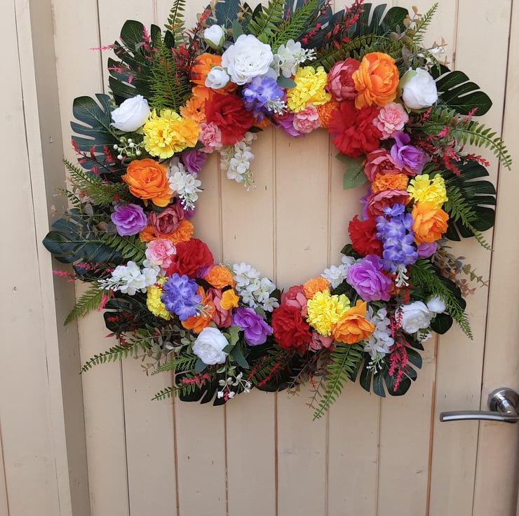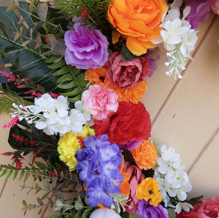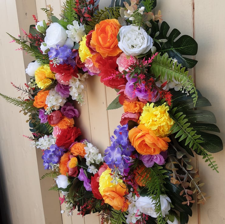 56cm wreath orange, white, purple, red, peonies, red ,yellow, orange, pink dahlias, white roses and wisteria. Green, red and pink , foliage.