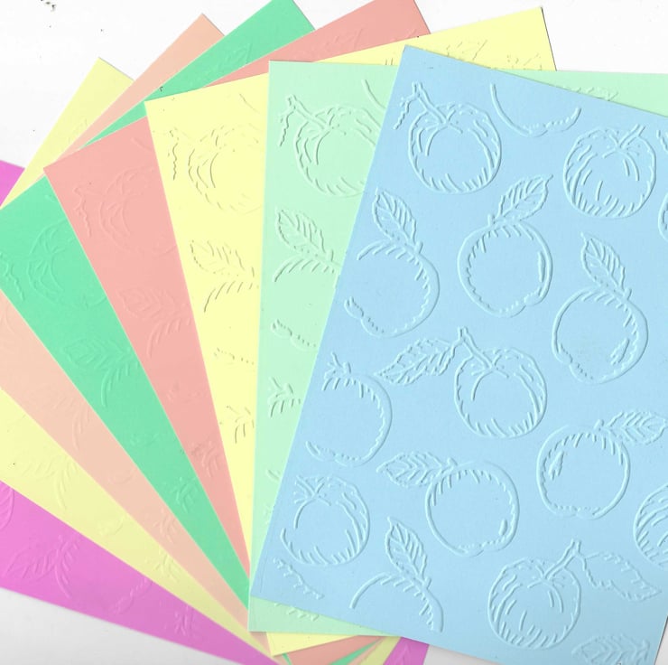 This set features 10 sheets of 5"x7" embossed card or paper adorned with a detailed apple design in assorted colours. Crafted for expert crafters, these textured sheets provide a sophisticated touch to your projects, ideal for card making, scrapbooking, and decorative crafts. The variety of colours enhances creative possibilities across different themes and seasons.