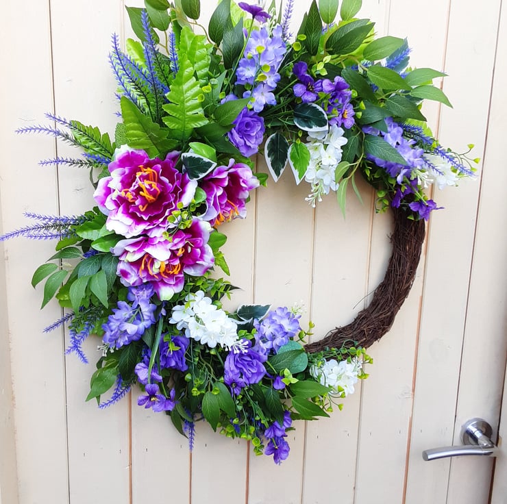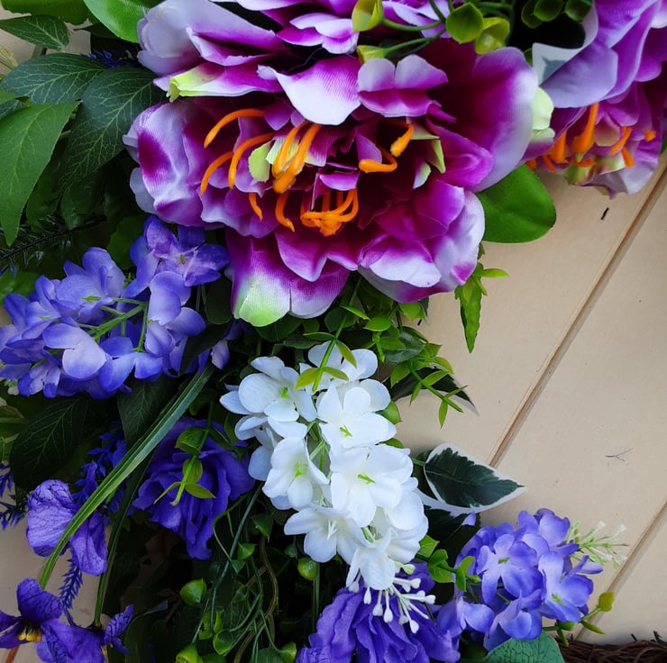 Half covered wreath. 60cm. Green foliage, with purple peonies, purple roses, purple and white wisteria.