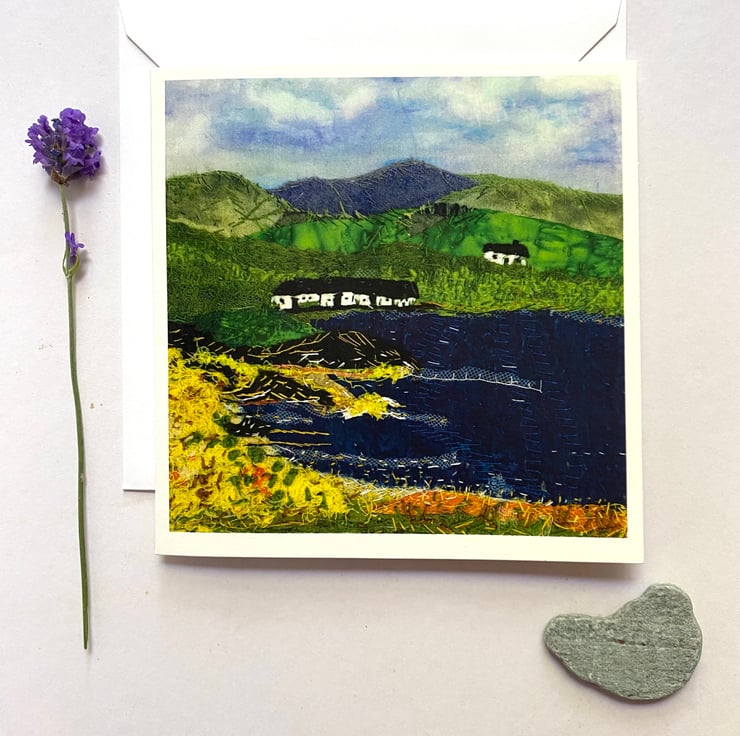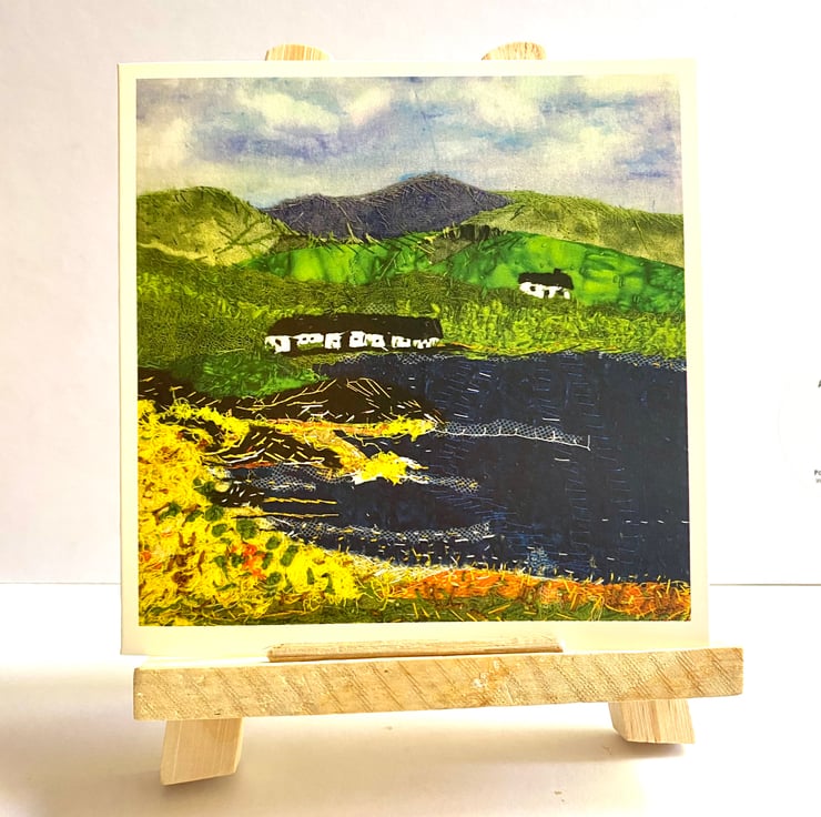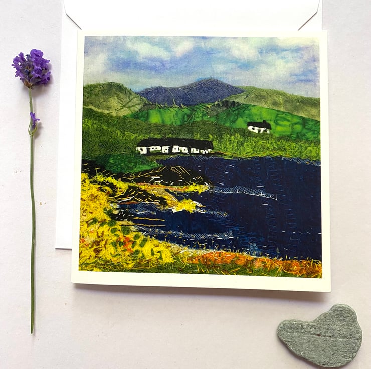 Professionally scanned and printed square greeting card. This is a copy of my original textile art. The end of the loch.