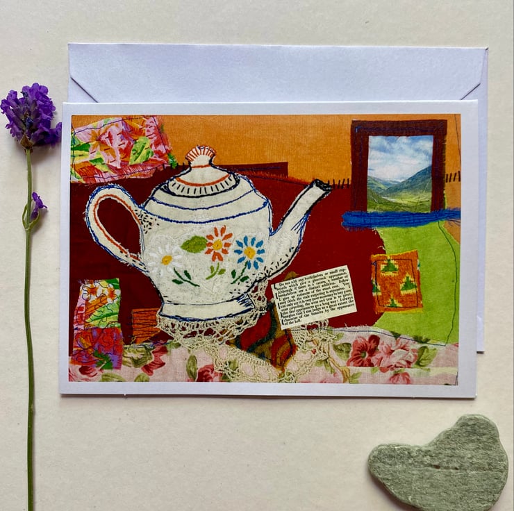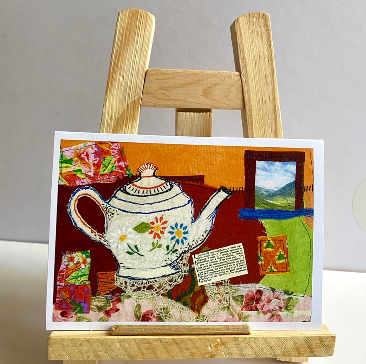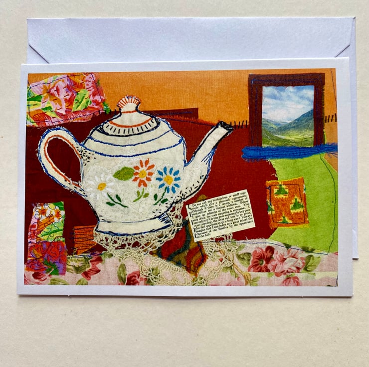 Tea anyone? Is a mixed media hand and machine embroidered collage.