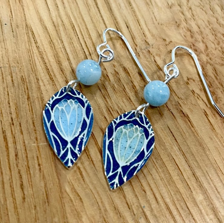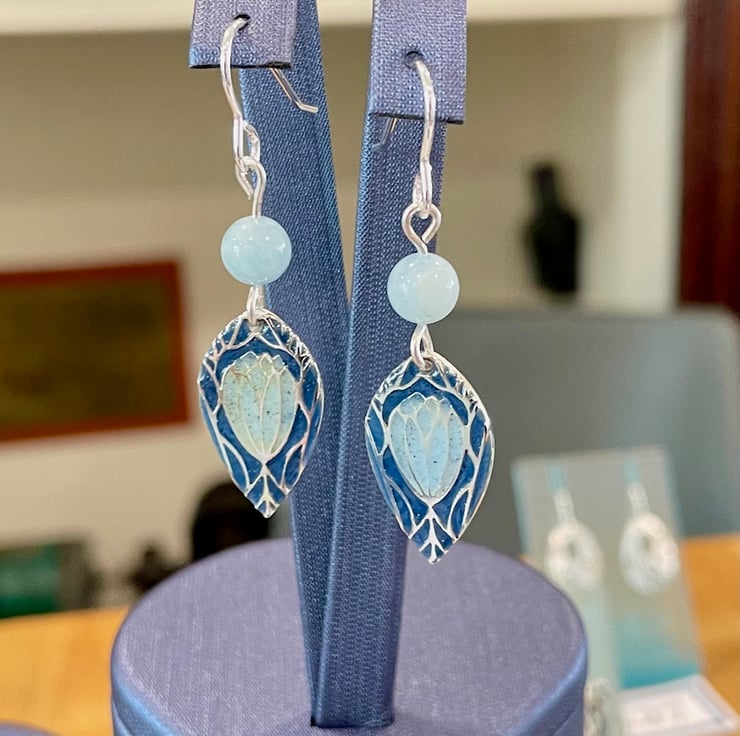 A statement pair of earrings incorporating fine silver base, with enamelled art nouveau flower design and blue lace bead.