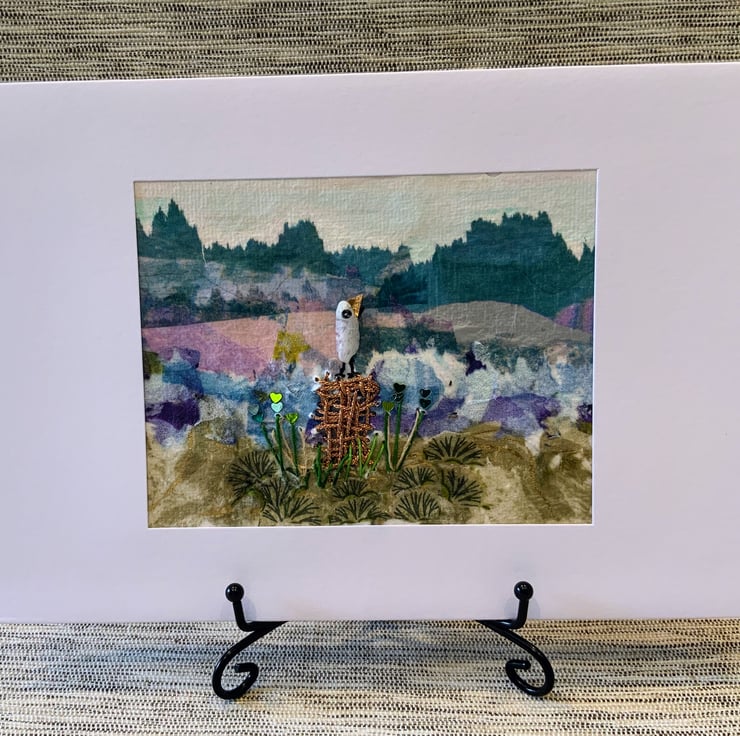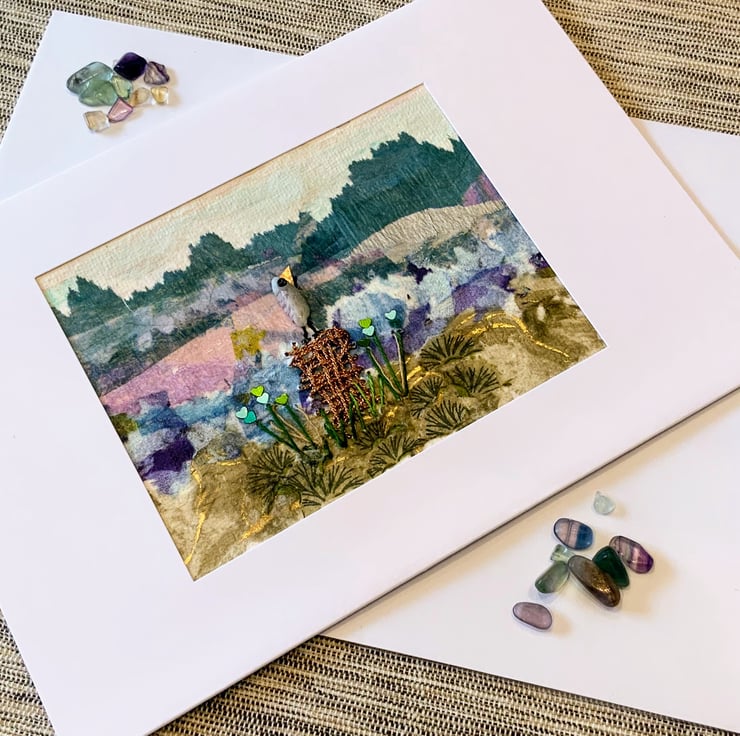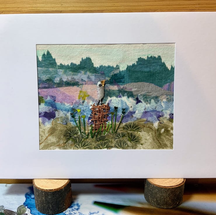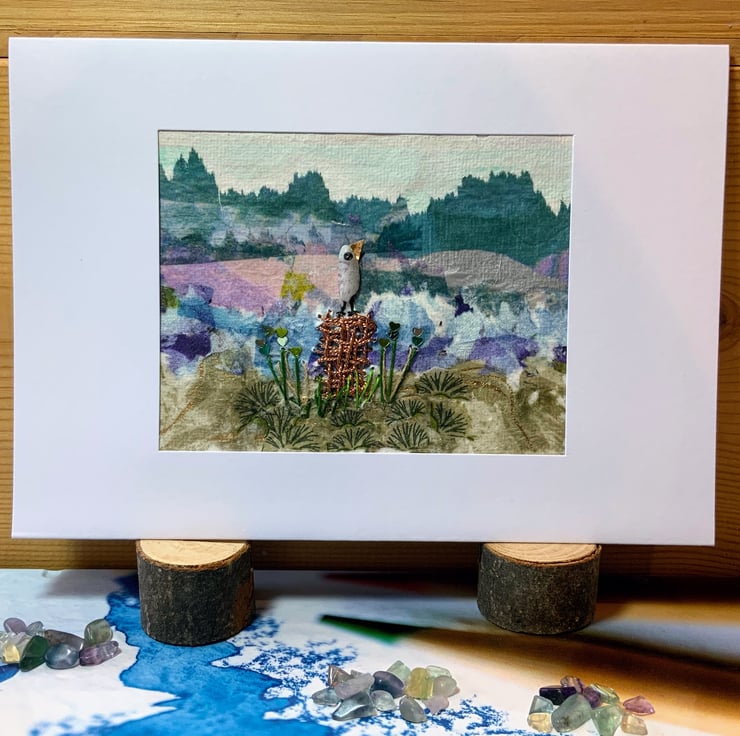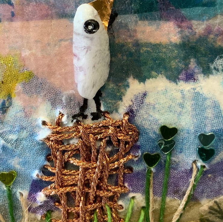 In the centre is a bird perched on an embroidered log with wild flower stalks and sequins The bird has been created using a natural Fluorite Chip Gemstone Bead.