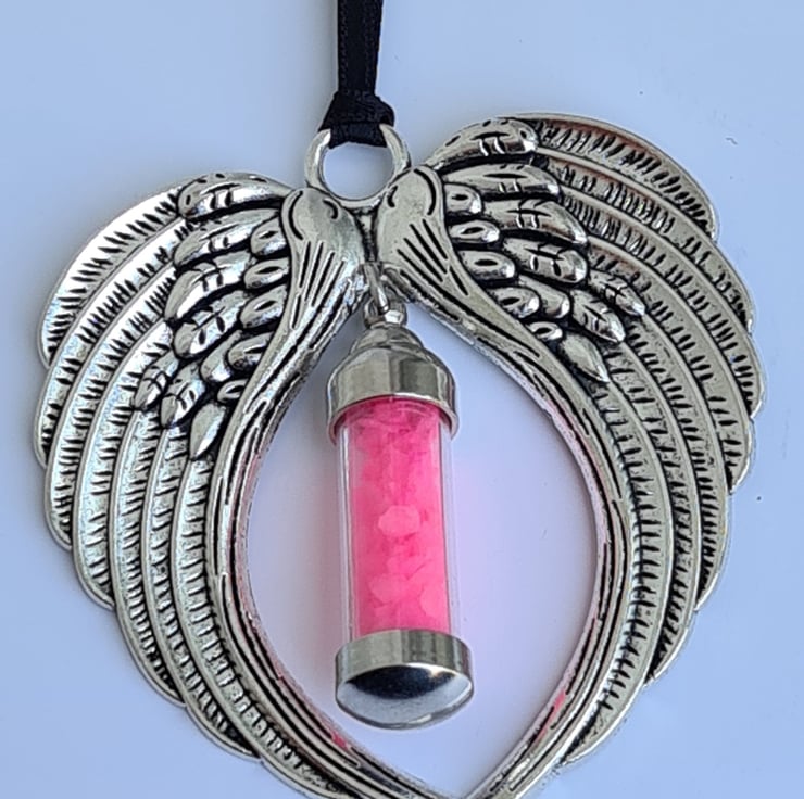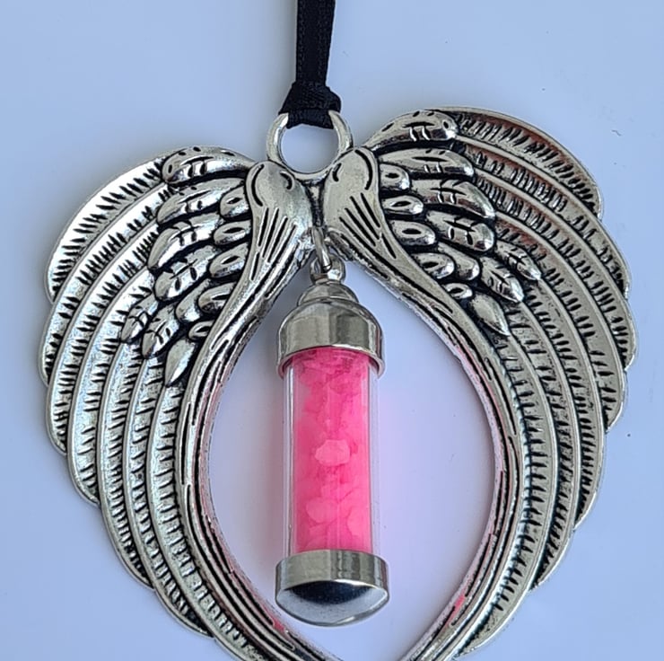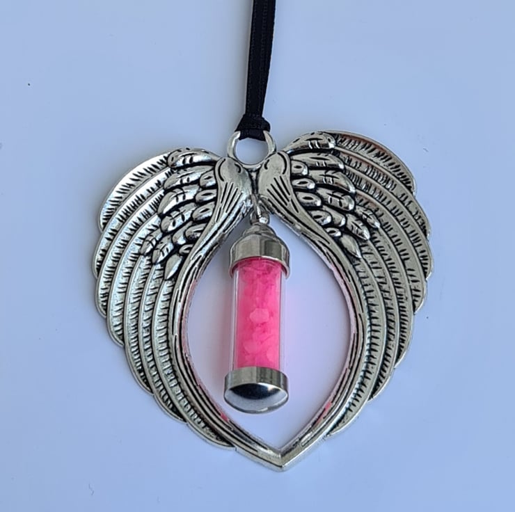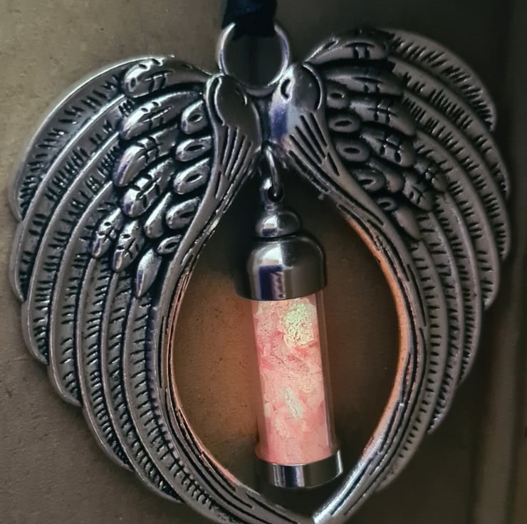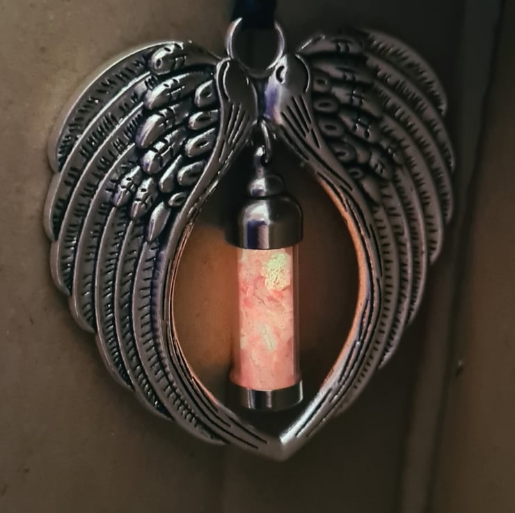 Ornament size: Angel wings approx 7cm H x 6.5cm W. I have adapted the Wings charm to accommodate the capsule. Hanging length approx 15cm from top of ribbon to bottom of decoration. Capsule is made of glass and metal and contains Pink glow in the dark gravel. Gravel glows an Yellowy-Orange. Capsule measures approx 4.5cm. Capsule will be sealed so it can not be unscrewed.