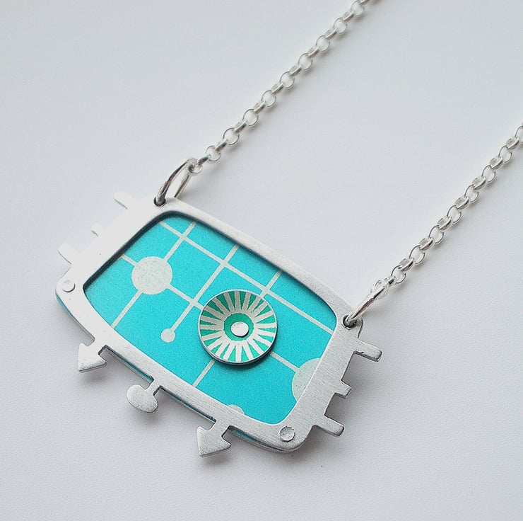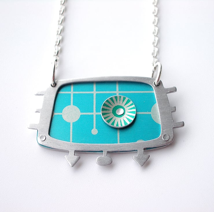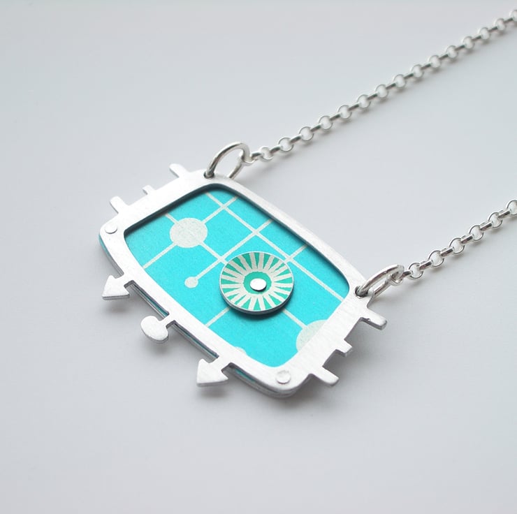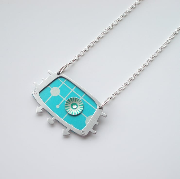 This unique mid century style rectangular necklace is made from hand dyed anodised aluminium and framed with brushed aluminium. I have dyed the patterned piece in turquoise and printed with a silver mid century modern pattern, adding a jade green striped disc to give a pop of colour. I have made the frame from aluminium which I have saw pierced by hand and filed to give a nice smooth edge. Finally there is a plain rectangle of brushed aluminium on the rear of the piece and all three pieces are held tightly together by hand made aluminium rivets.