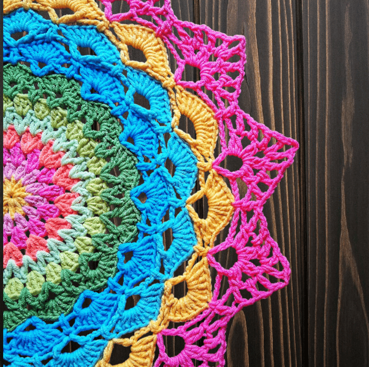 Large, bright crochet mandala doily table mat