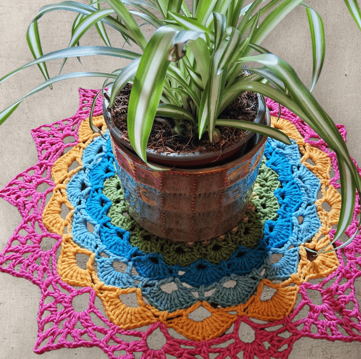 Bright crochet mandala doily. 37 cm in diameter. Perfect for giving your table a pop of colour. Crocheted in vibrant cotton blend yarn to maintain colour and ease of wash.