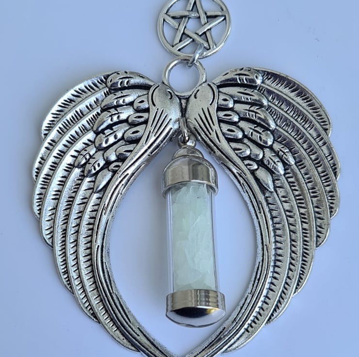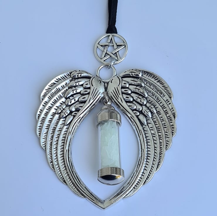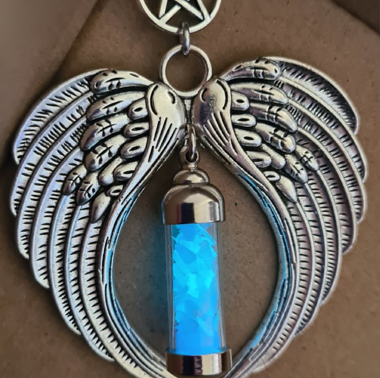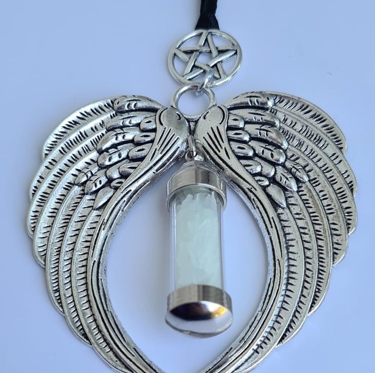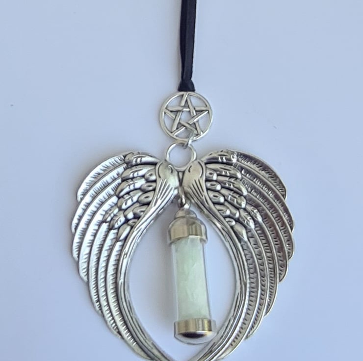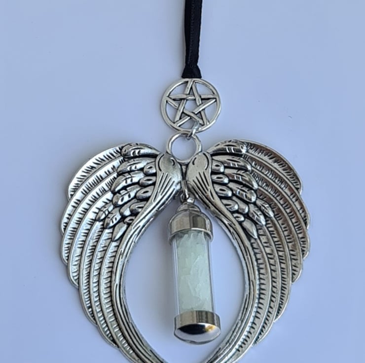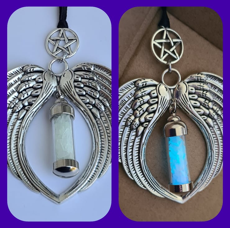 Fab as a hanging decoration or as a Christmas Tree ornament. Gorgeous, Silvery Angel wings with a capsule containing glow in the dark gravel (Angel Grace) with a pentacle charm on a Black Satin Ribbon.The gravel contained in the capsule glows in the dark after being exposed to a light source (glows better with a UV Torch). An unusual gift for those who love Angels, mystical stuff, unusual gifts or Glow in the dark stuff.