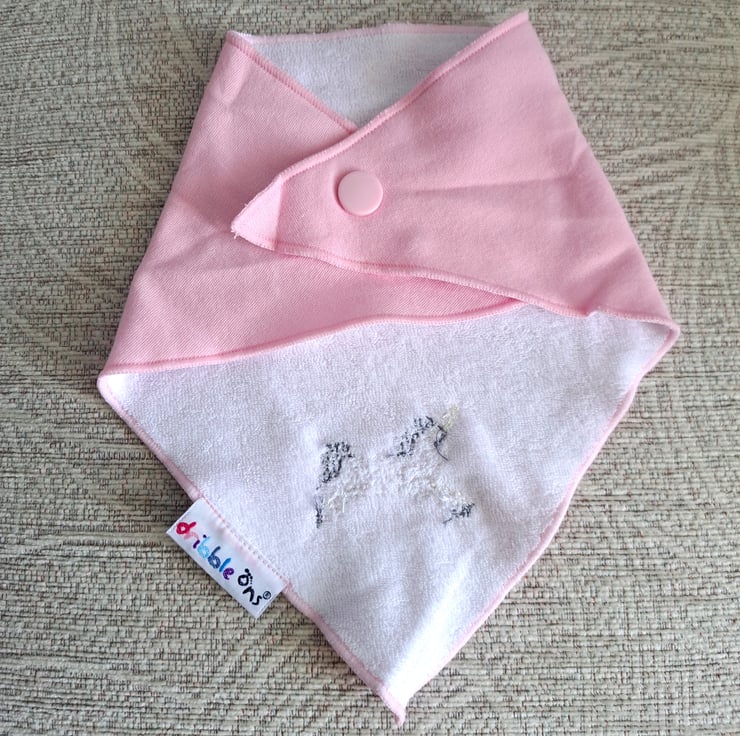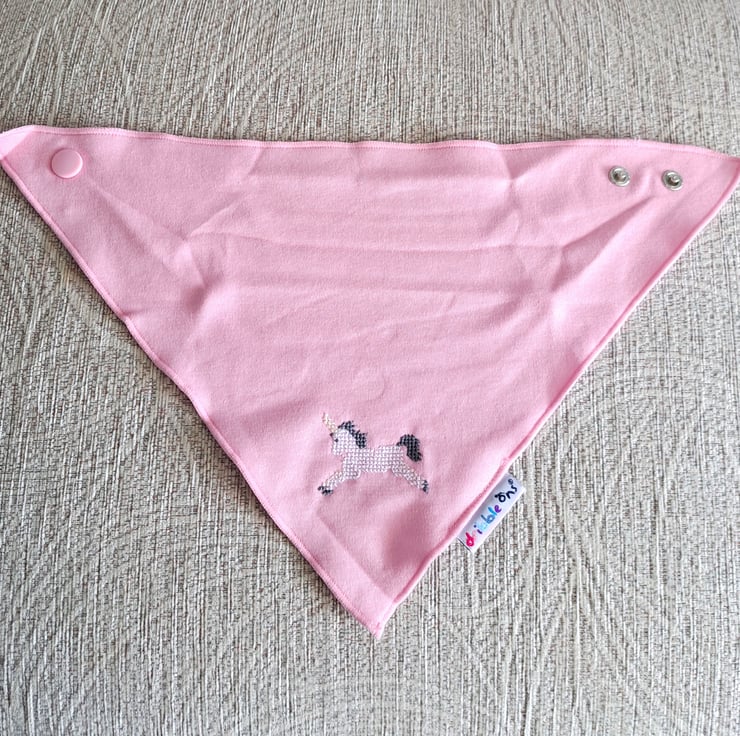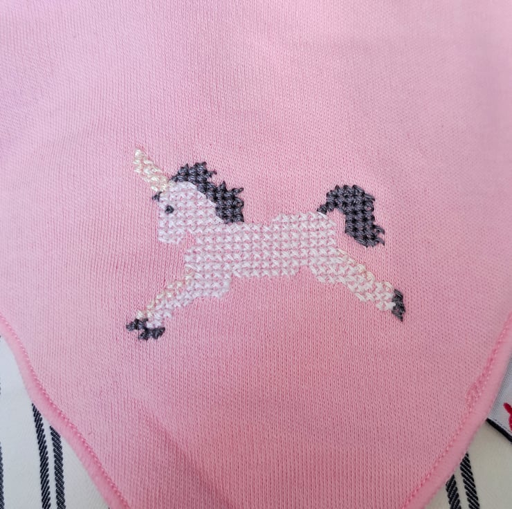 What a gorgeous little pink bandana bib this is! I have hand embroidered a white unicorn, with a sparkly ivory horn and grey mane, tail and hooves, on its lower corner. The front of the bib is cotton jersey and the back cotton polyester towelling. It fastens with one of two press studs at the back of the neck and is machine washable.