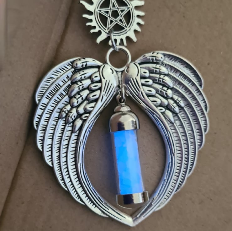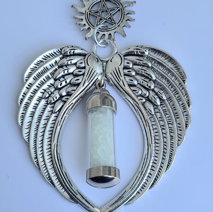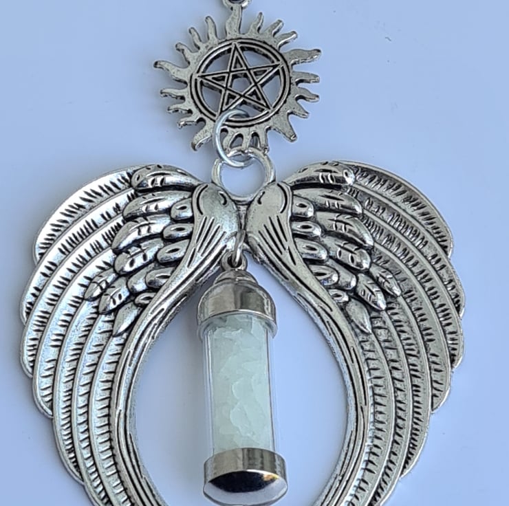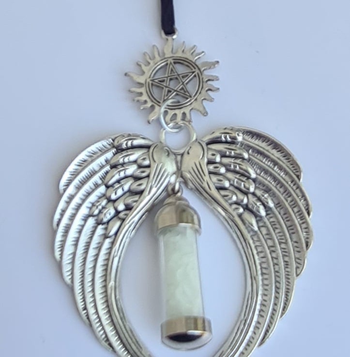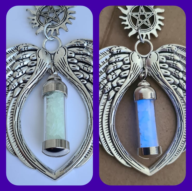 Fab as a hanging decoration or as a Christmas Tree ornament. Gorgeous, Silvery Angel wings with a capsule containing glow in the dark gravel and a flaming pentacle charm on a Black Satin Ribbon.The gravel contained in the capsule glows in the dark after being exposed to a light source (glows better with a UV Torch). An unusual gift for those who love Angels, mystical stuff, unusual gifts or Glow in the dark stuff.
