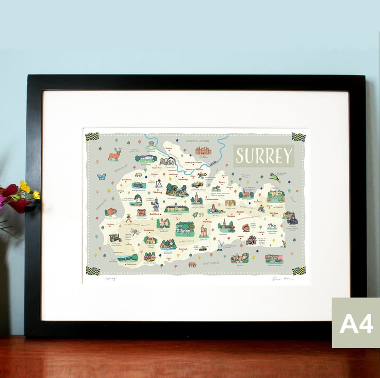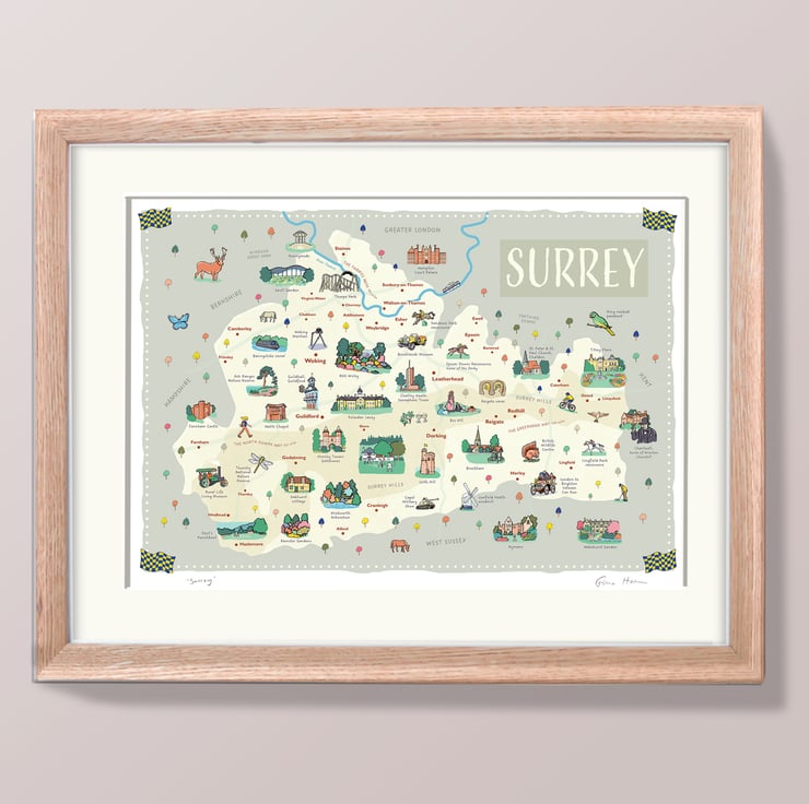 Surrey map poster A4, illustrated by Fiona Horan, Woking, Dorking, Guildford