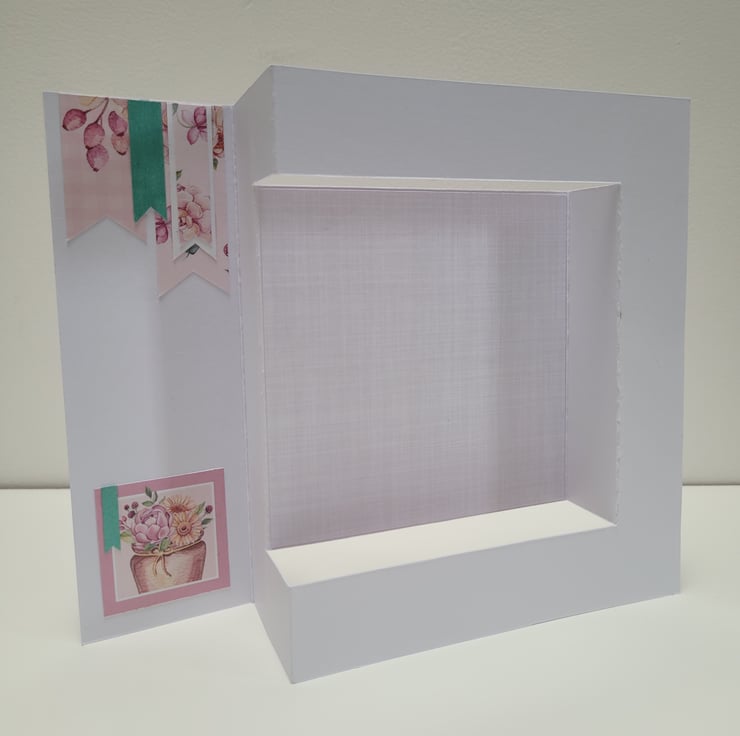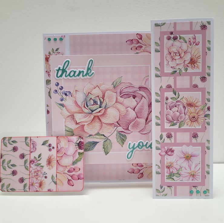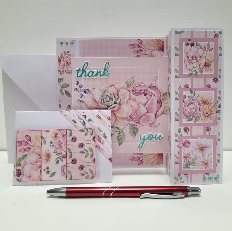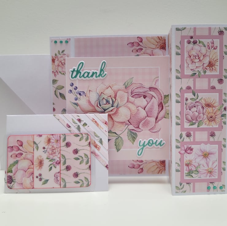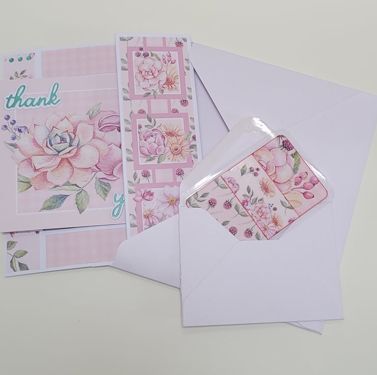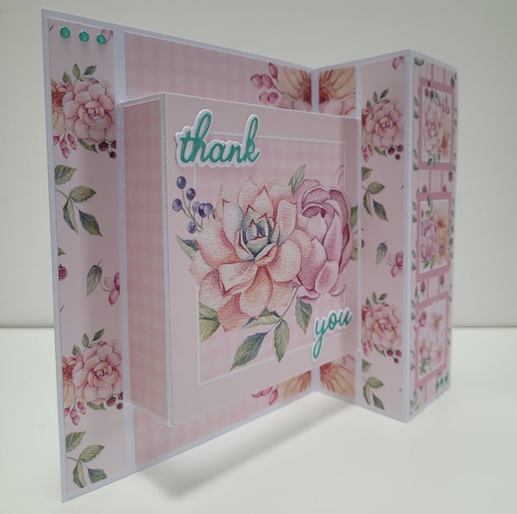 Decorated with floral printed papers and a die cut thank you sentiment in a complimentary metallic teal colour. The card (folded) measures 5 x 6 inches / 13 x 15 cm, is blank on the reverse for your own message, and is supplied with a plain white envelope.