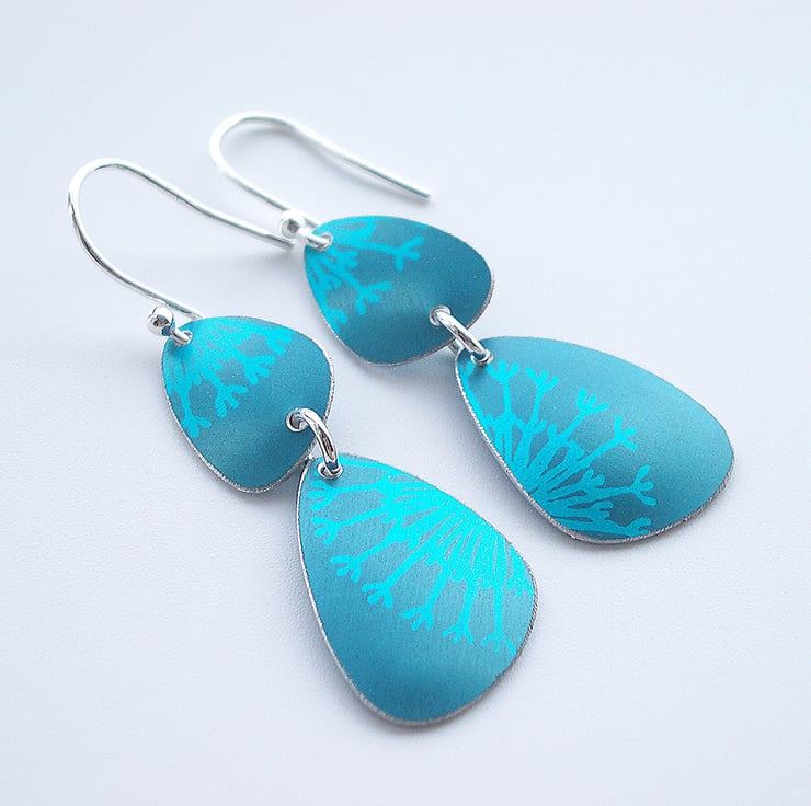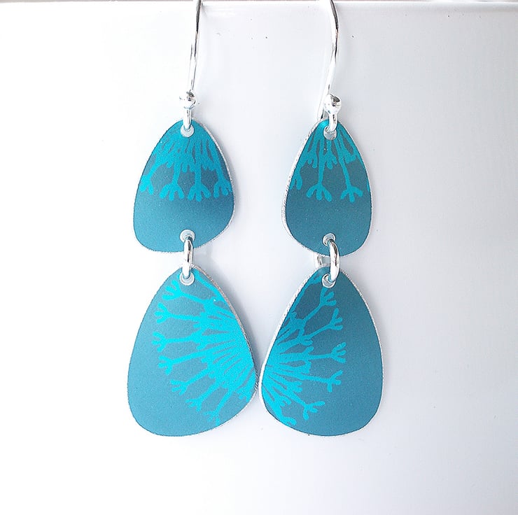 These mid century inspired earrings are made from anodised aluminium which I have dyed in teal and turquoise and printed with a seed head design. I cut the pebble shapes by hand using a jeweller’s saw and file the edges to give a nice smooth finish. Finally I dome the pebble shapes so that they catch the light.