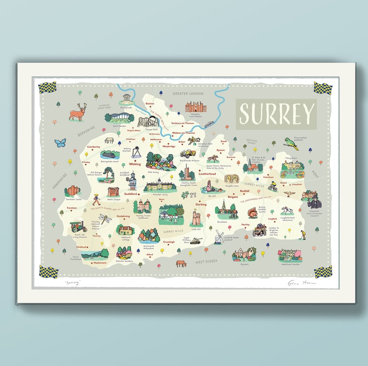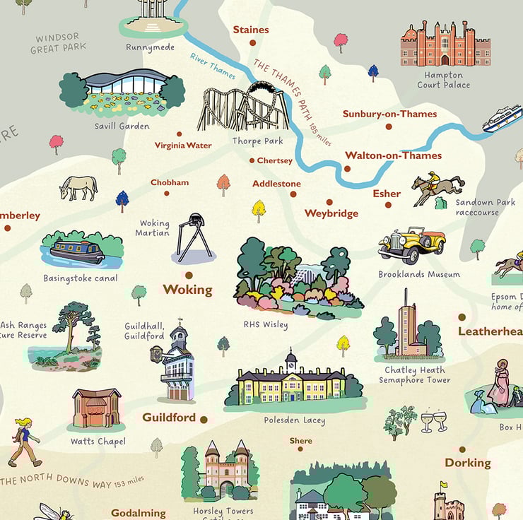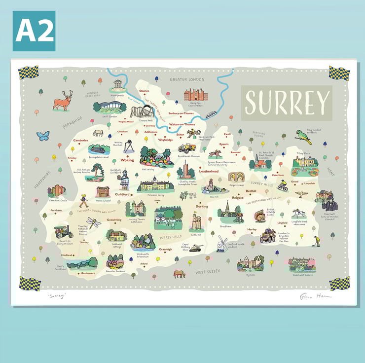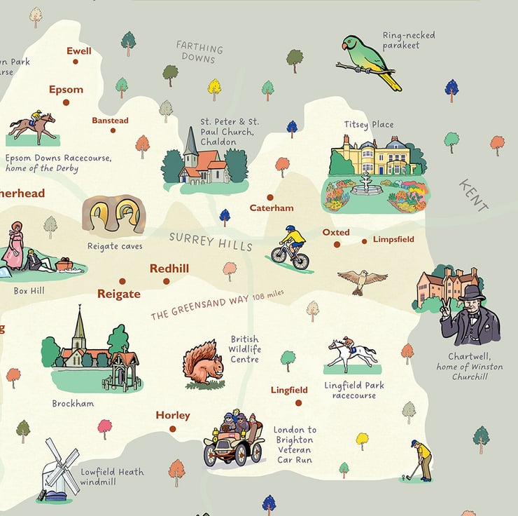 Beautiful illustrated A2 wall map of the English county of Surrey - famed for its beautiful hills and woods, and attractive villages and towns.