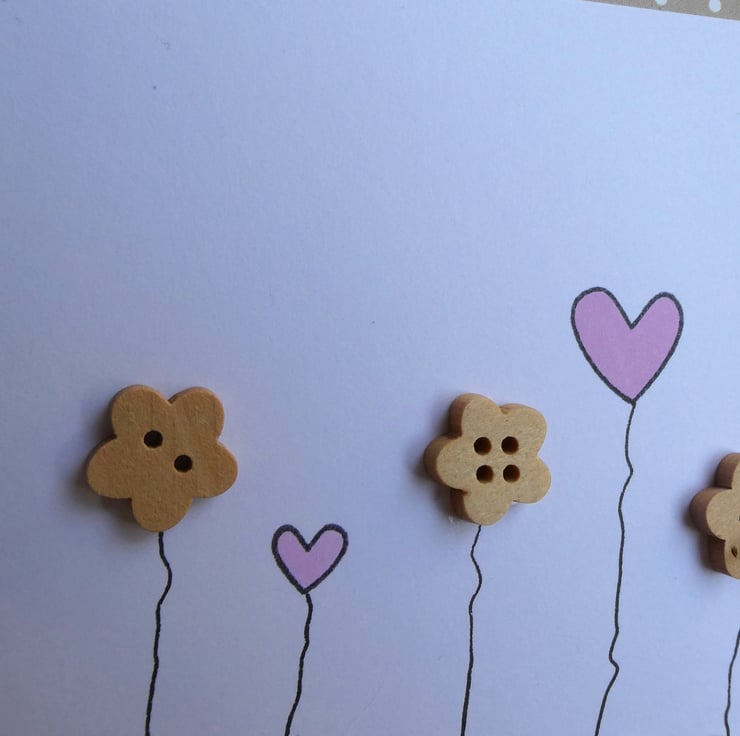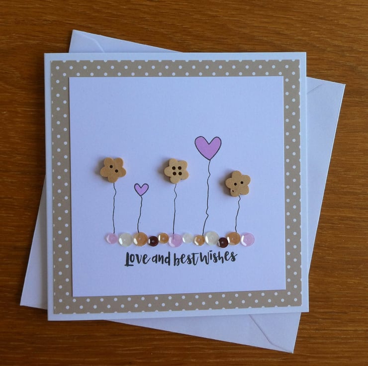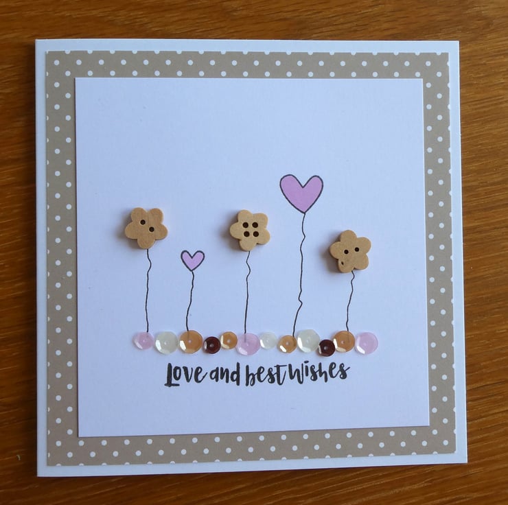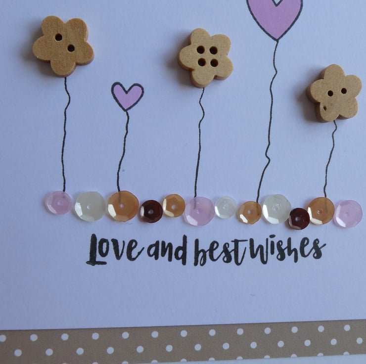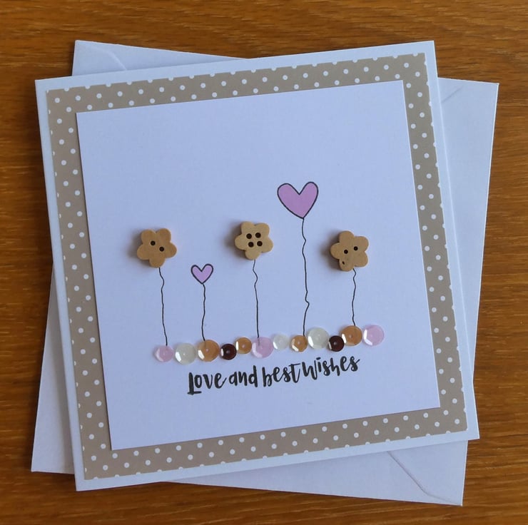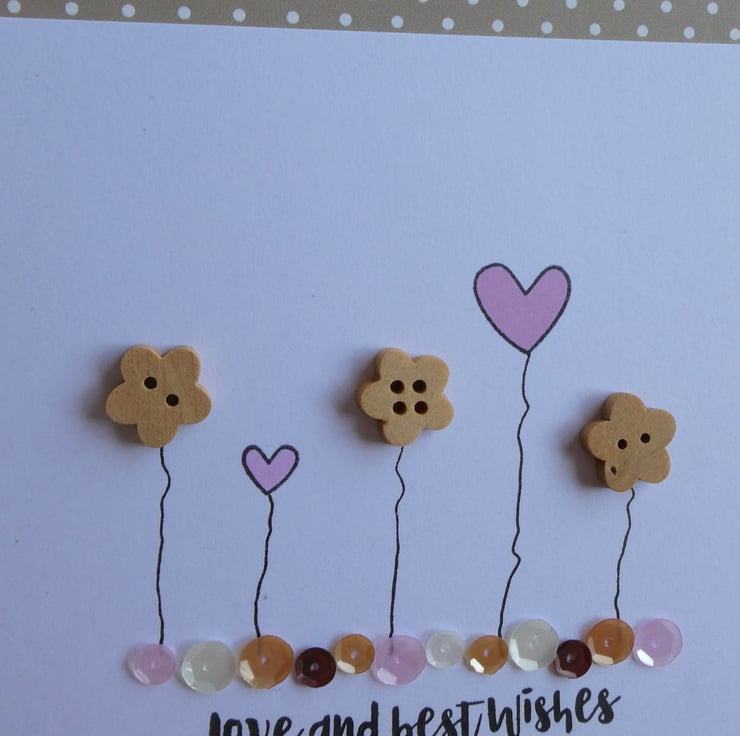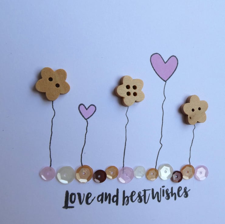 With the message Love and Best Wishes this pretty card could be sent as a birthday card, a get well or anniversary card or just to let someone know that you are thinking of them. It has a row of wooden button flowers and pink hearts, sitting above a line of pastel sequins and the greeting Love and Best Wishes.