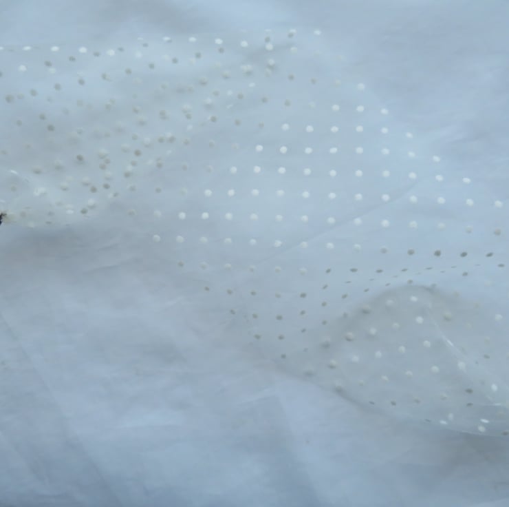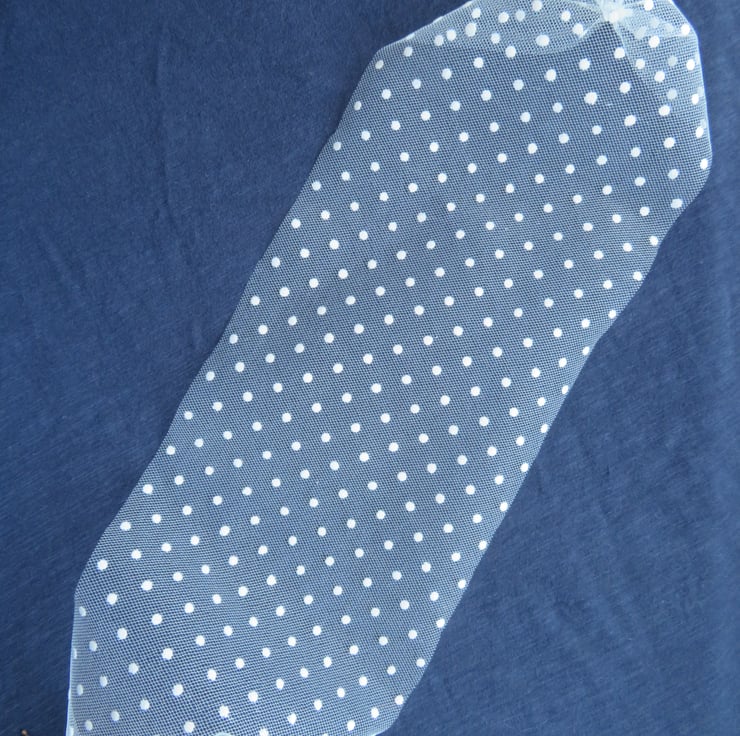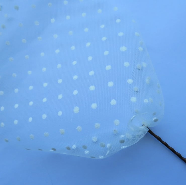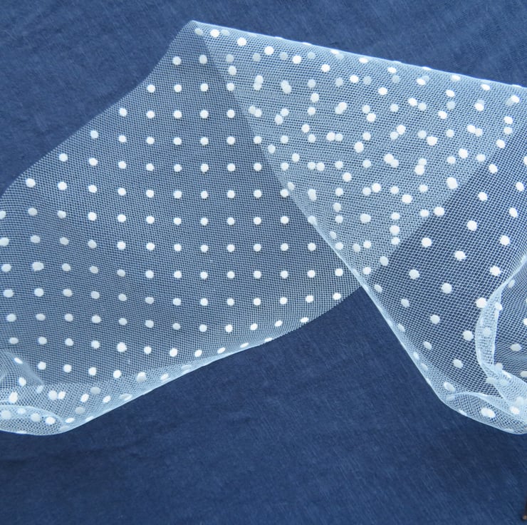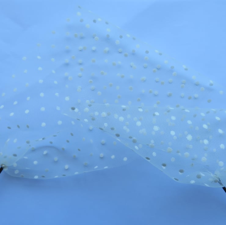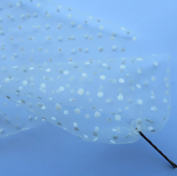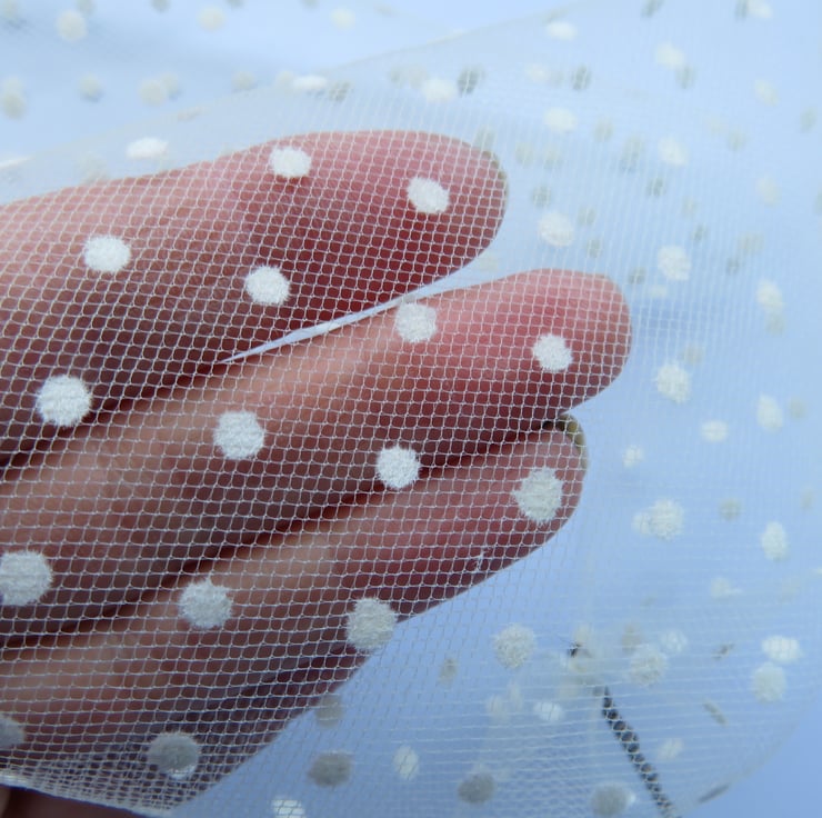 This is a narrow bandeau birdcage style veil made from a beautiful stretchy flocked spot/ dot cream ivory mesh tulle.