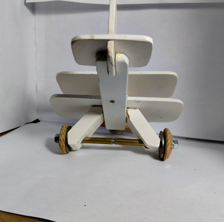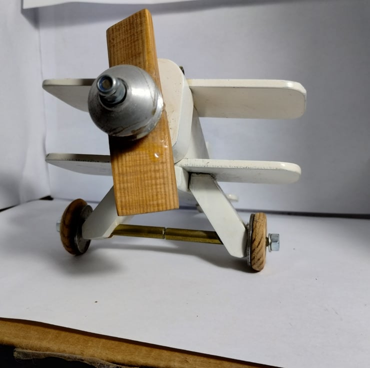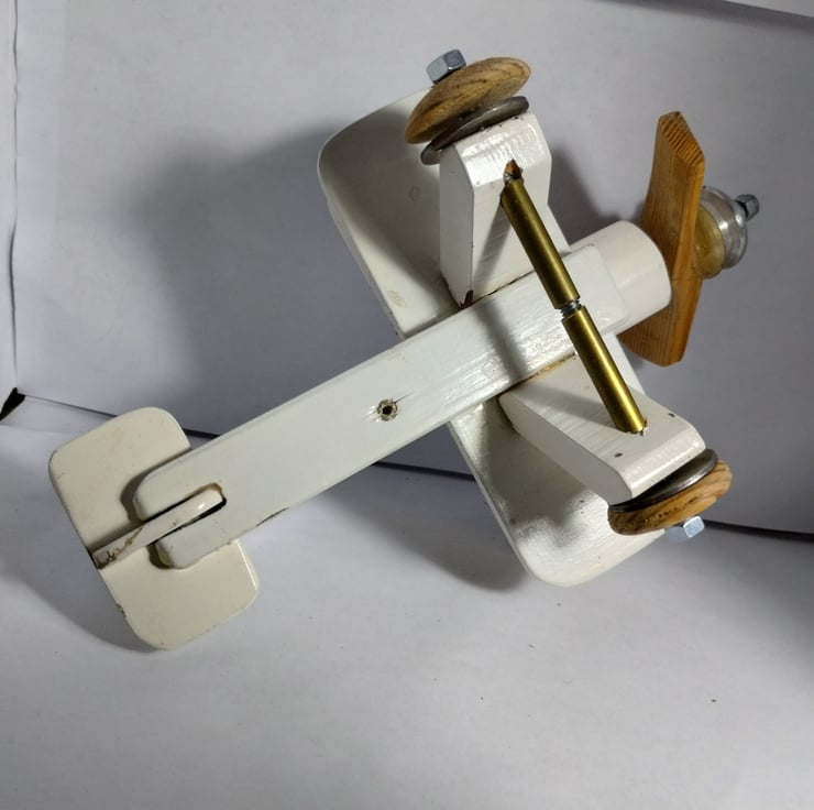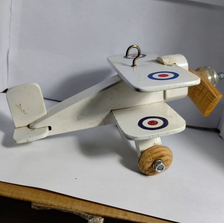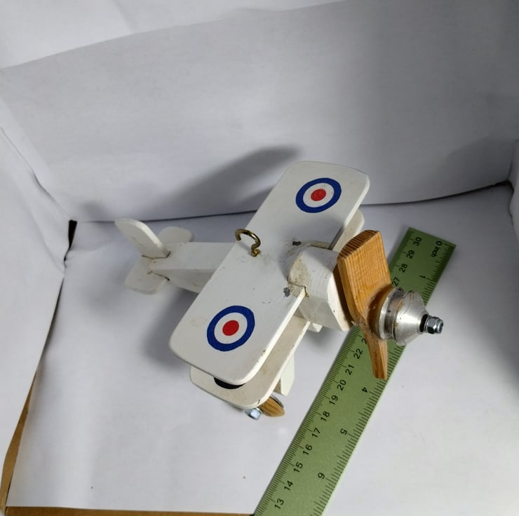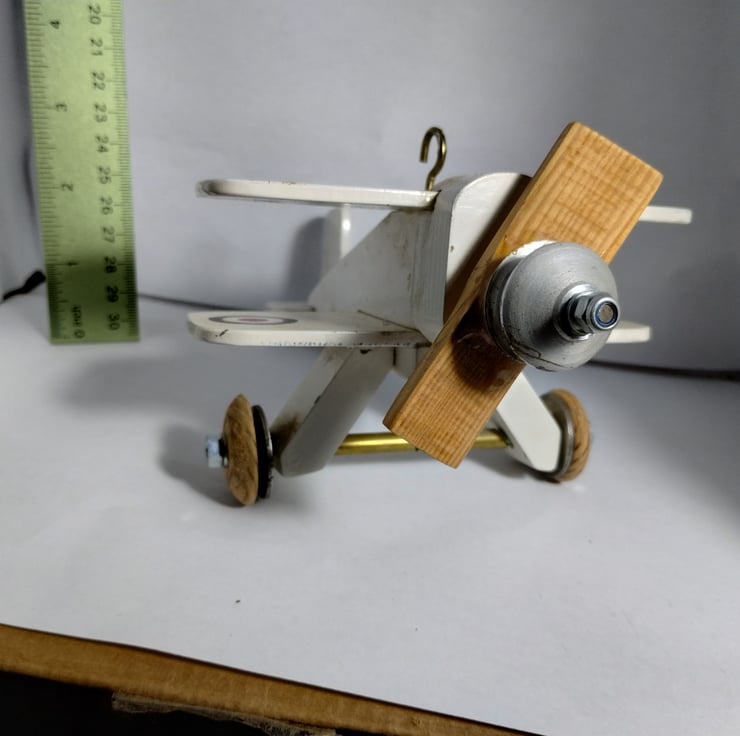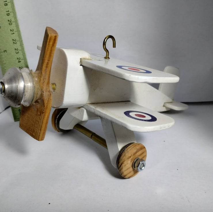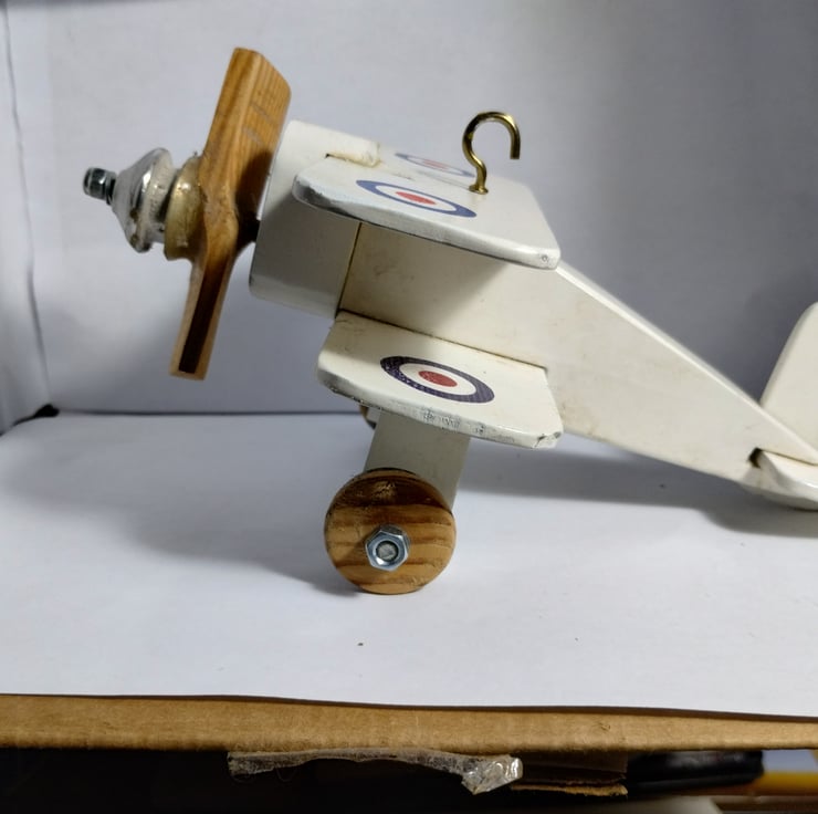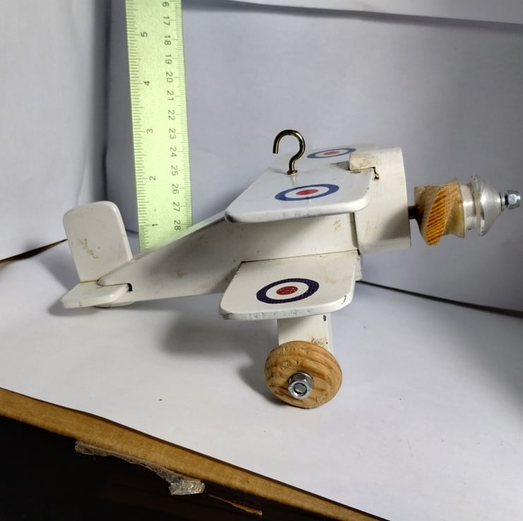 a bi plane I made 20 years ago for a cam toy project to show the kids at the school where I was working. It sat on my desk for years then sat on the side at home, so I thought to offer it to a new home. The propellor spins (and originally had an elastic band connecting the aluminium pulley to the cam toy). It is a bit battered and stained, but that adds to its charm... it must be 20 years old. The idea is it is a hanging toy, hence the hook, would make a nice toy for a child, probably not for under 36 months...