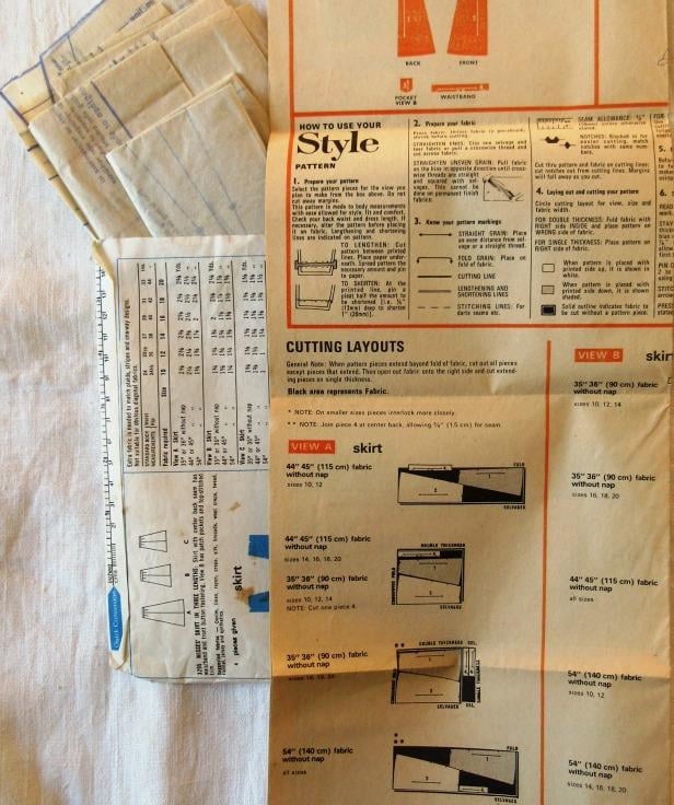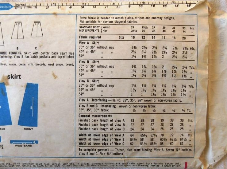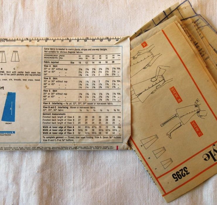 A vintage sewing pattern for a misses' skirt in three lengths in size 12 (waist 25.5"/65 cm, Style 3295). The skirts have centre back seam, waistband and front button fastening. View A is ankle-length, view B, with patch pockets and top-stitching is below-knee length and view C is knee-length. The pattern has been used to make the shortest version, but the excess paper has been retained. The pattern is dated 1971.
