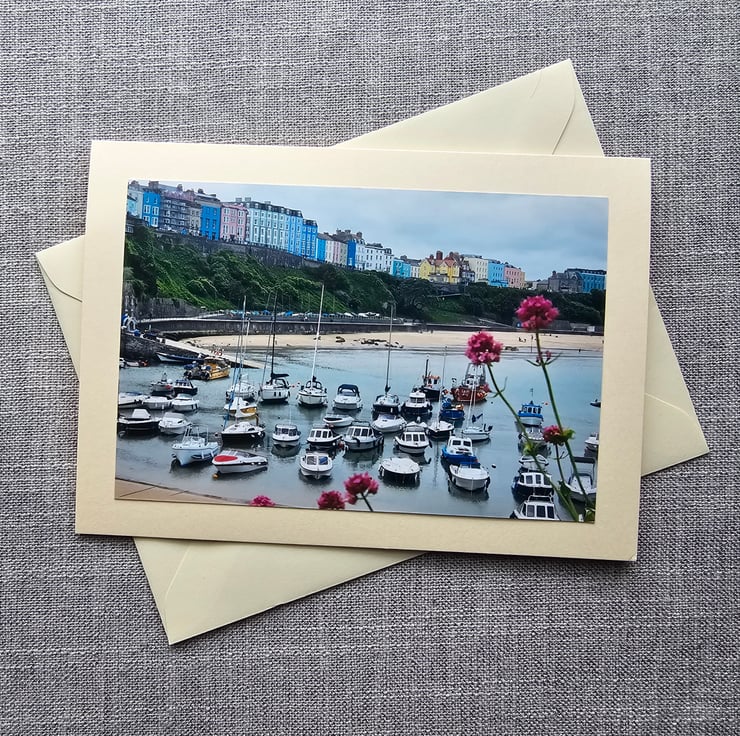 A lovely view of Tenby harbour and some of it's Victorian houses in pastel colours framed by wild flowers. This photo was taken on a recent family holiday (June 2025). It has definite holidays vibes to it. A blank card suitable for ANY OCCASION and can also be kept and framed.