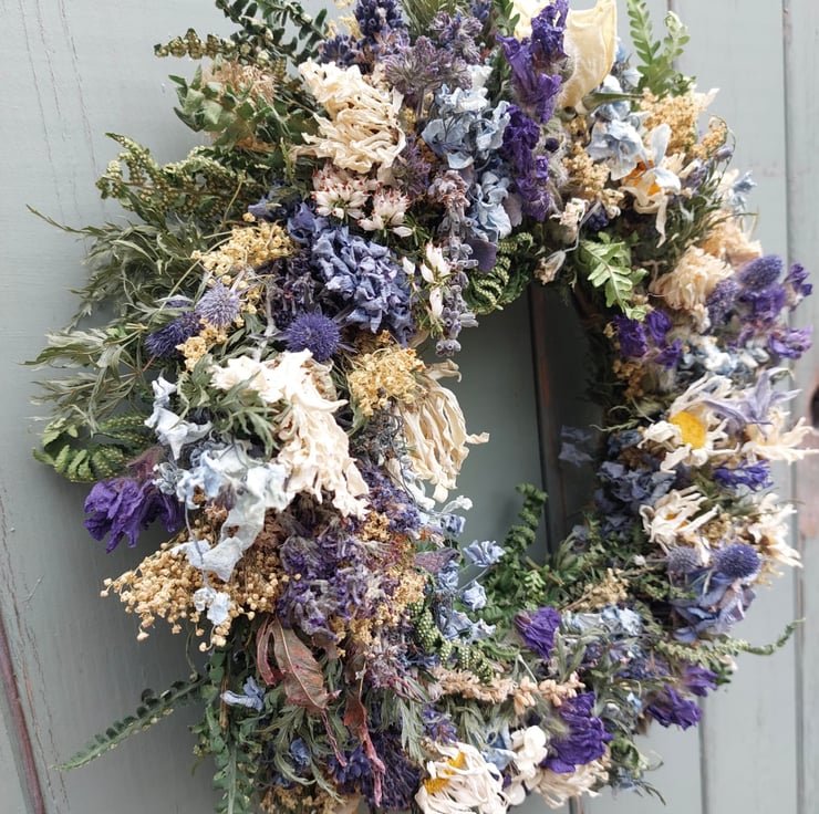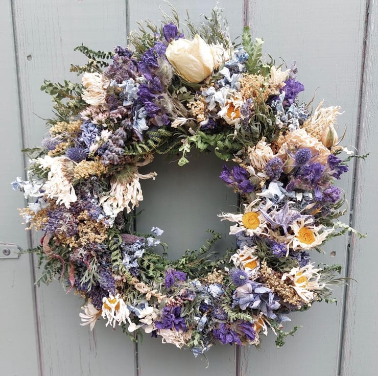 A handmade dried flower wreath measuring approximately 28cm in diameter.