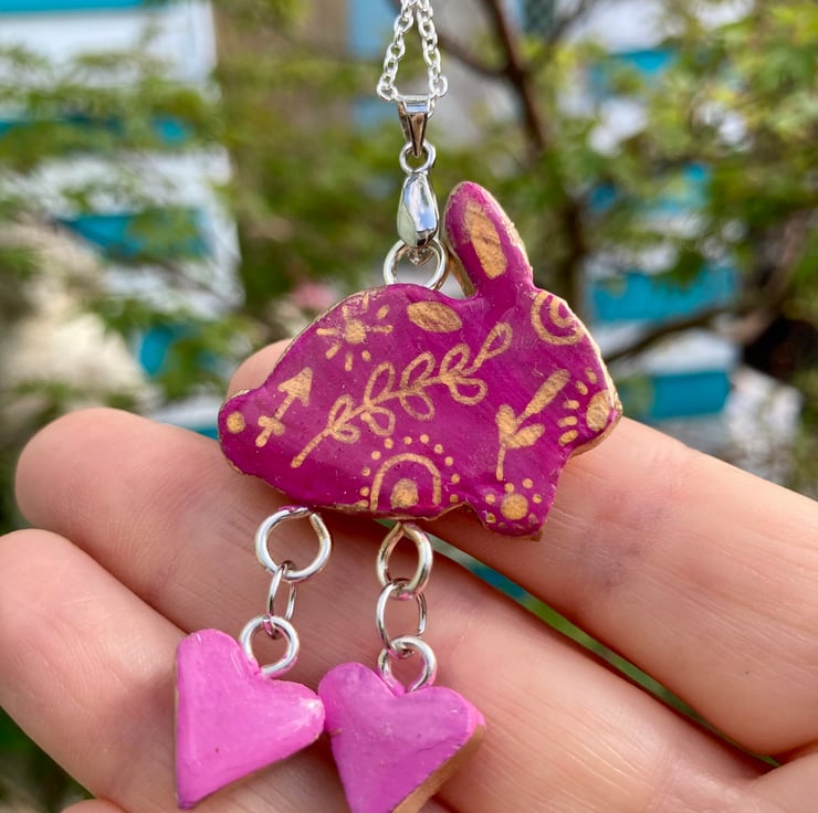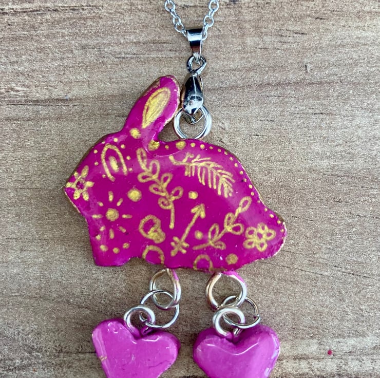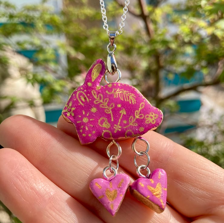 Bright Pink Boho Bunny Pendant Necklace with two heart charms