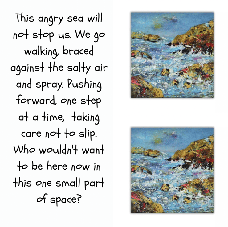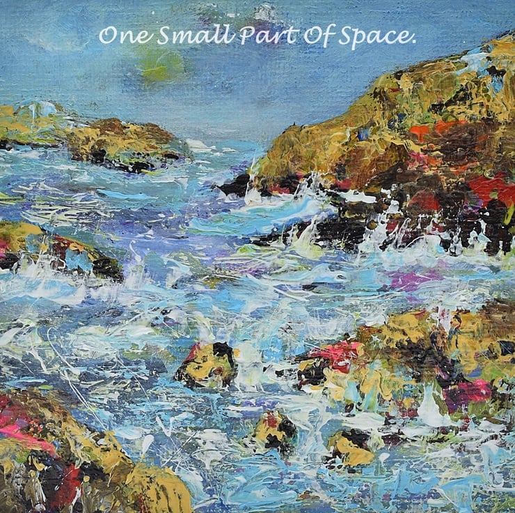 The sea is raging today and the flicks of cool coloured paint I've applied to the canvas, indicate the choppiness of the sea. The warmer colours I've used for the cliffs and land symbolise the safety of the earth in relation to the unpredictability of the water.