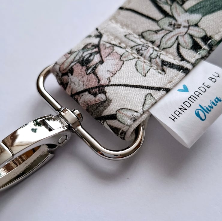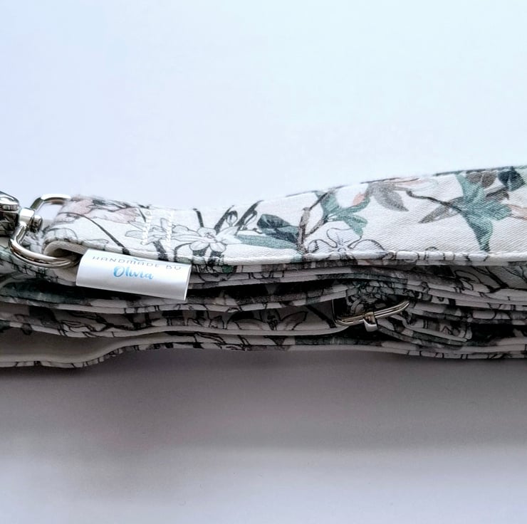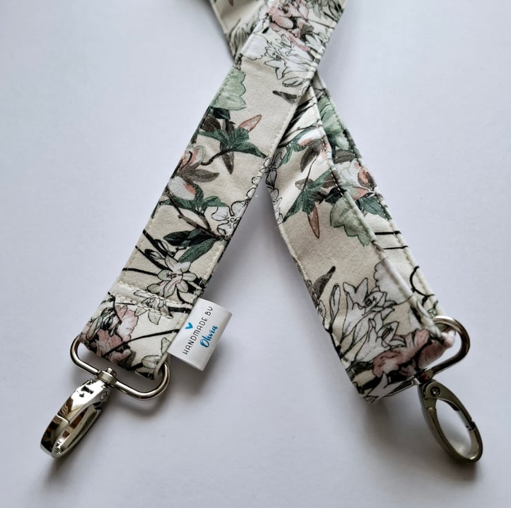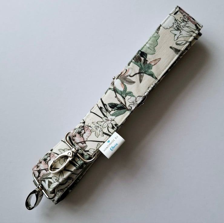 The strap was created with an unknown type of fabric and interfacing added for extra strength and comfort. Colours include a cream background, dark green, light green, pink and black. The silver metal hardware gives the strap a good visual effect. The strap length is fully adjustable from 69cm to 134cm (27" to 53").