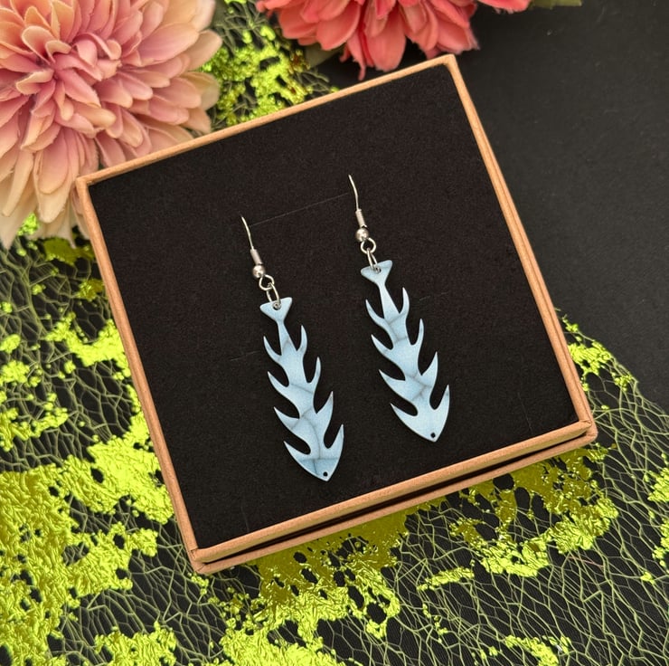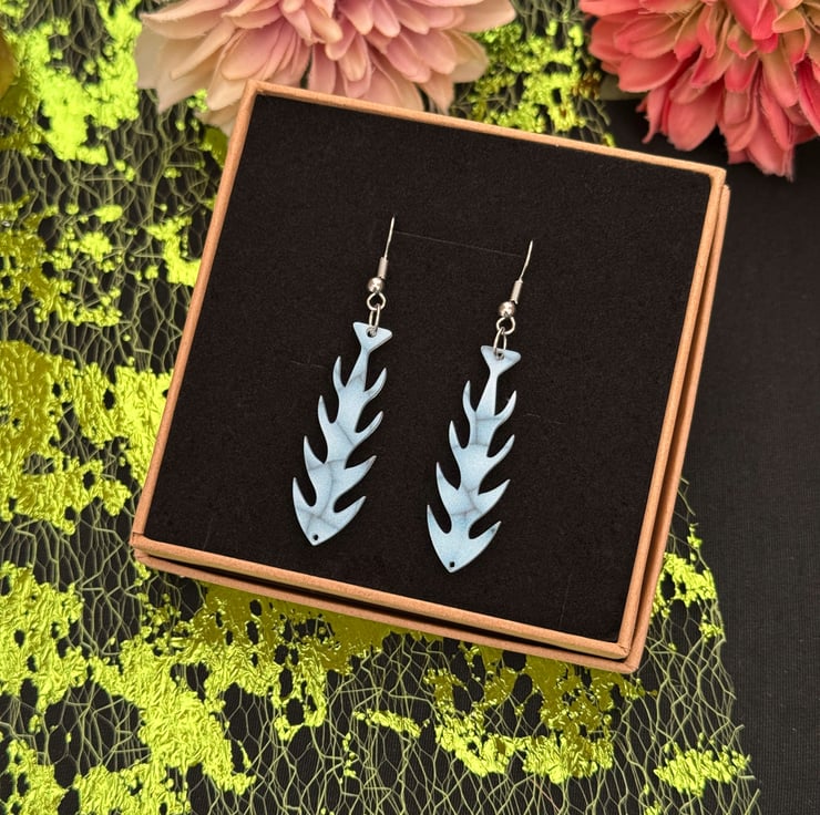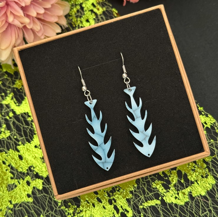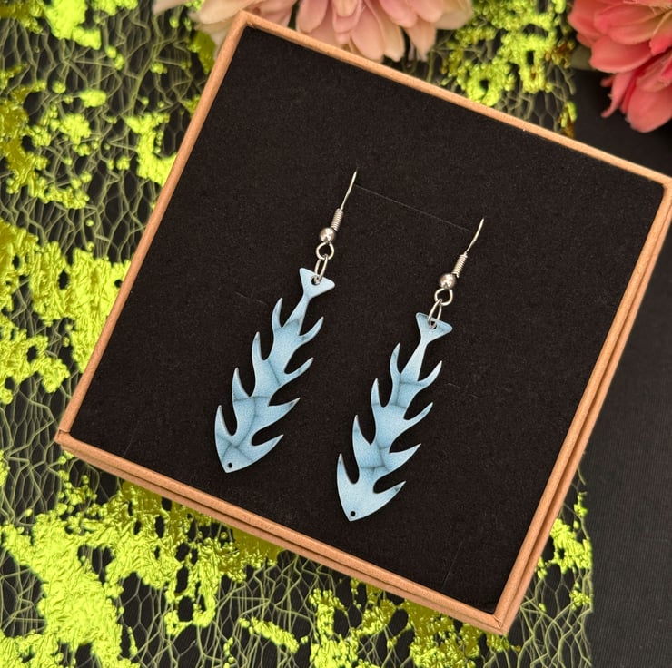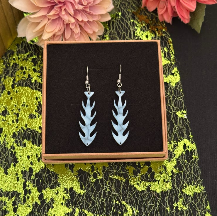 Featuring a unique whimsical stylised fishbone-inspired design in a soft matte blue crackle mosaic effect acrylic.