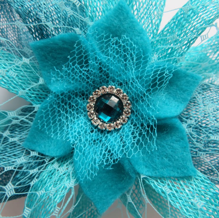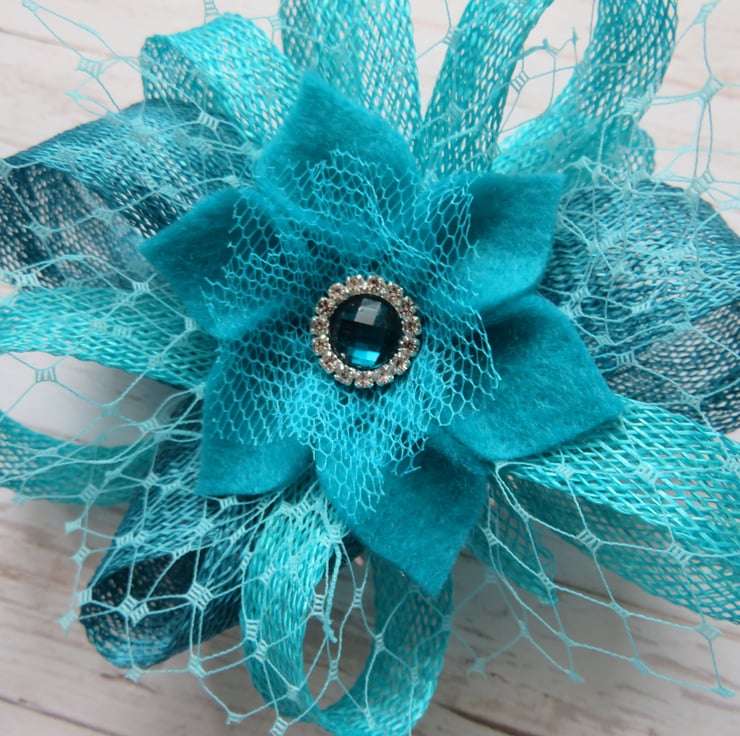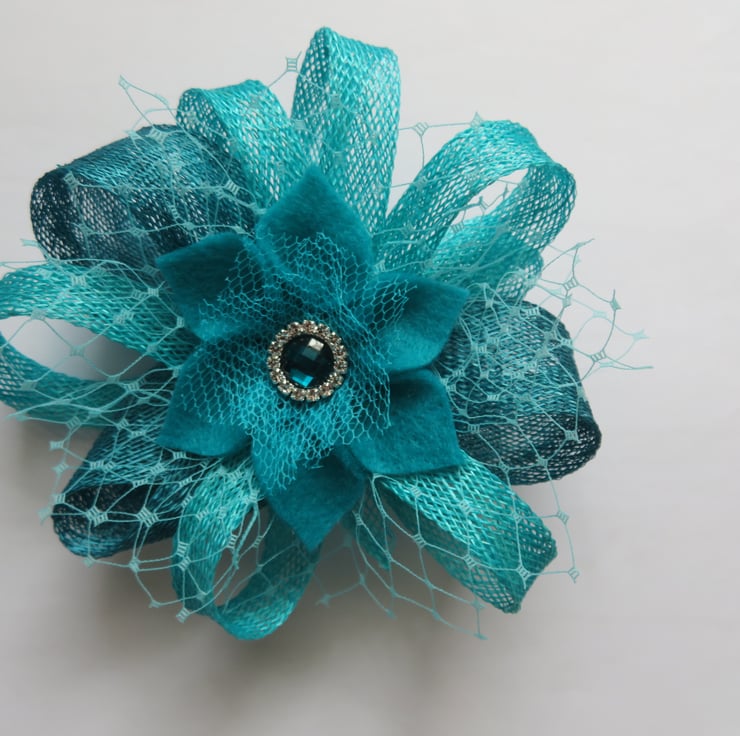 Crafted with a small double bow loop in contrasting shades of teal and turquoise sinamay, it's accented with delicate aqua veiling, a dainty teal felt flower, soft turquoise tulle, and a sparkling teal crystal and diamante centre.