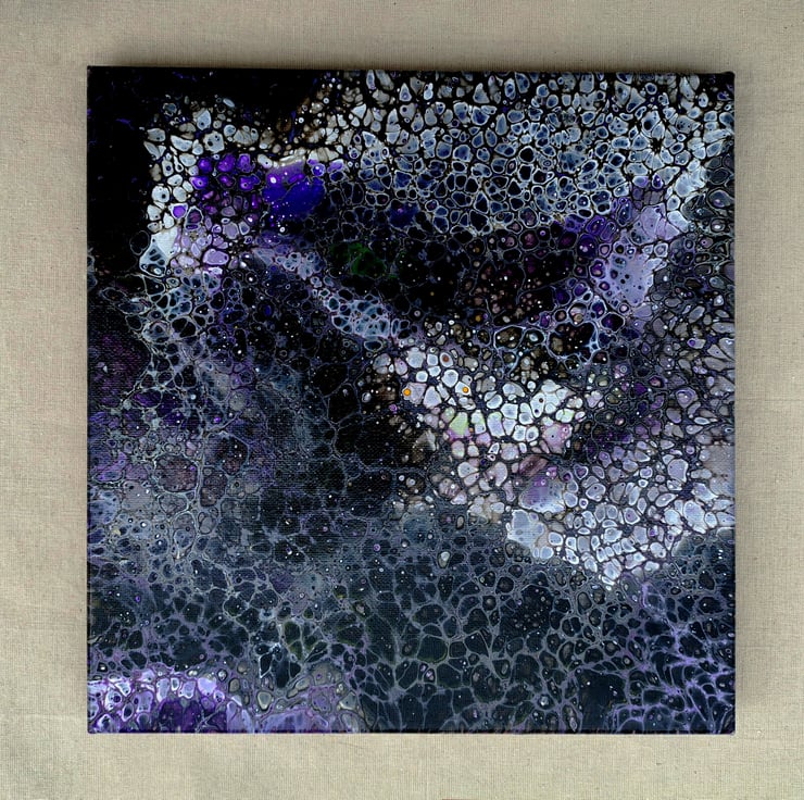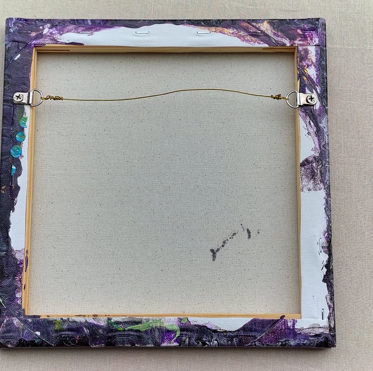 Acrylic Pour Canvas, with a purple, black, white and green colour scheme. This canvas has been fitted with D- Rings and hanging wire, and has been varnished with gloss varnish. The canvas size is W 25cm x H 25cm x D 1.5cm