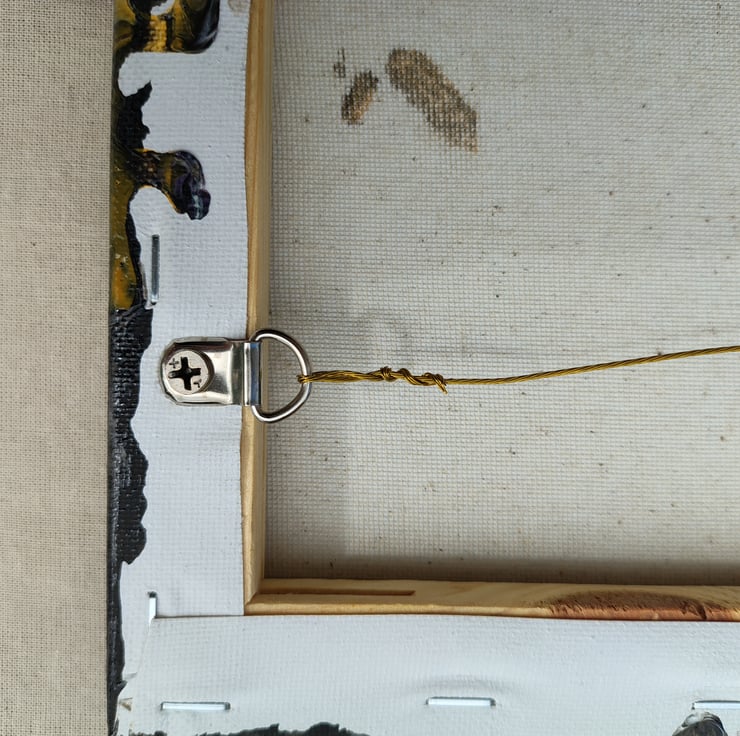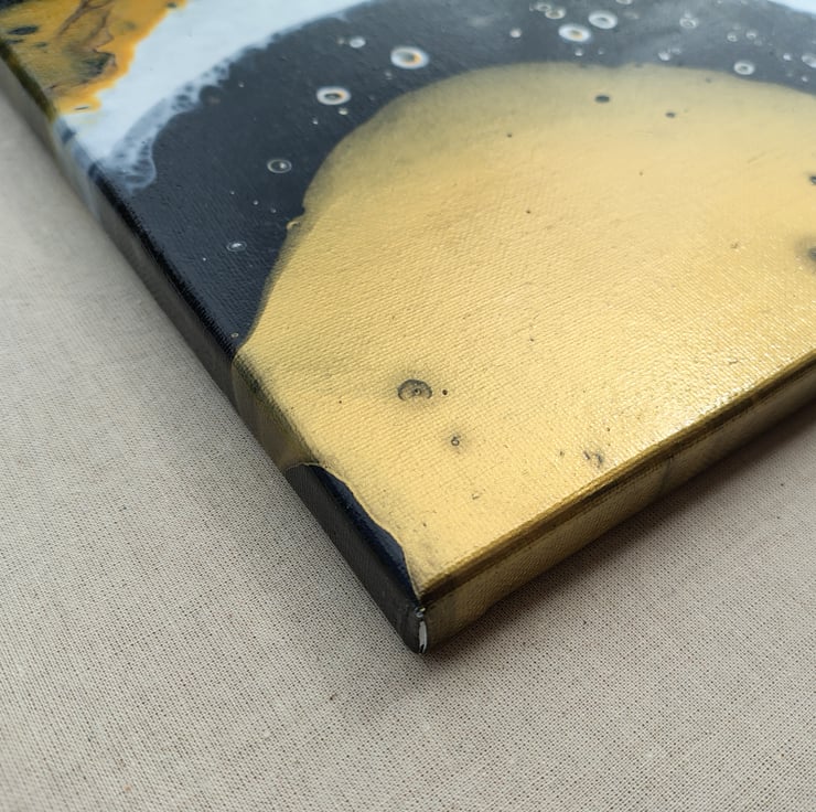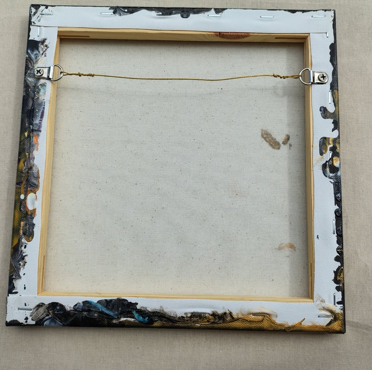 Acrylic Pour Canvas, with a purple, black, white and gold colour scheme. This canvas has been fitted with D- Rings and hanging wire, and has been varnished with gloss varnish. The canvas size is W 25cm x H 25cm x D 1.5cm