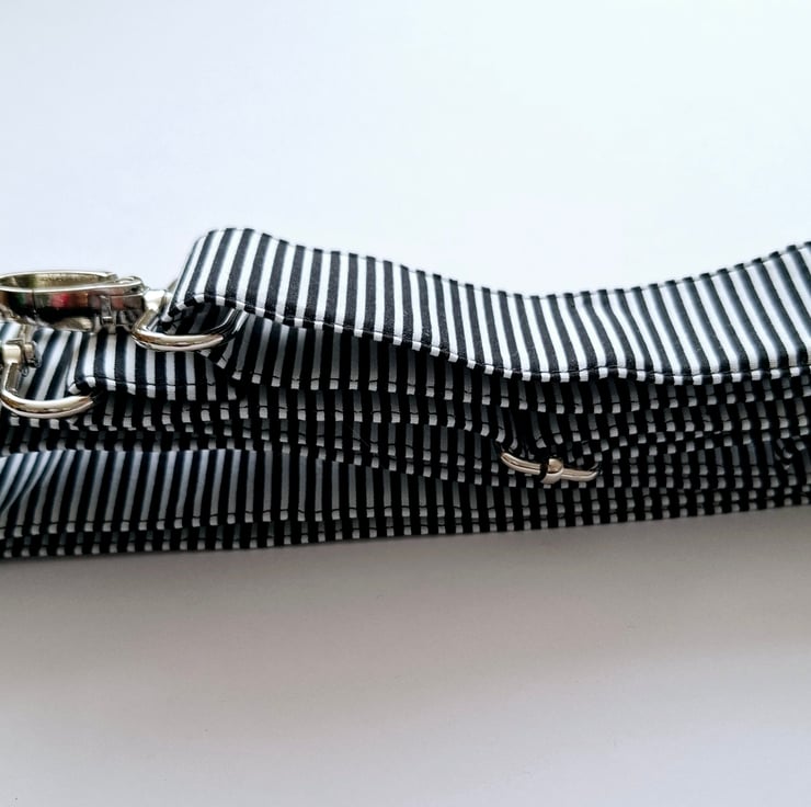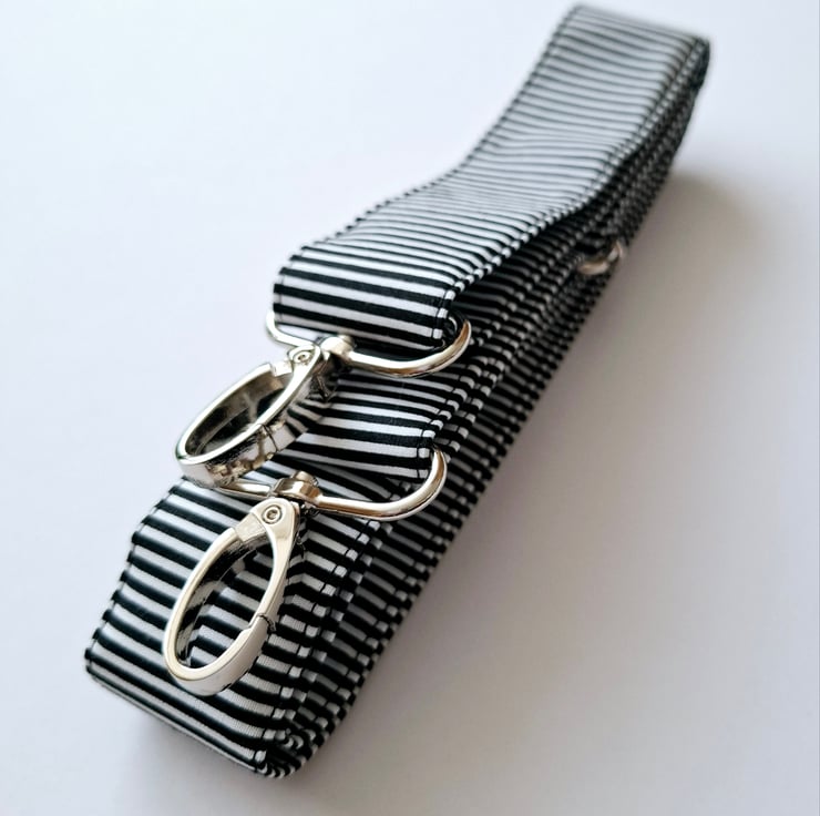 The strap was created with 100% cotton fabric and interfacing added for extra strength and comfort. Colours of the fabric is black and white. The silver metal hardware gives the strap a good visual effect. The strap length is fully adjustable from 69cm to 134cm (27" to 53").