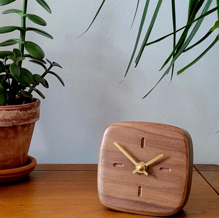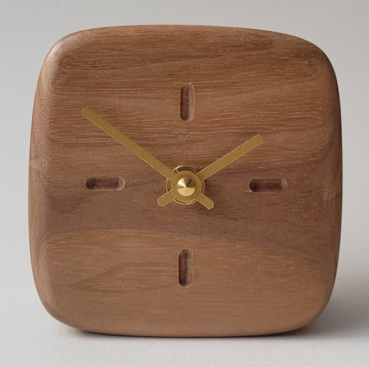 My Desk/Mantel Clocks are handmade from a solid piece of American Black Walnut, with "dash" indicators, marking 12, 3, 6 & 9 o'clock.