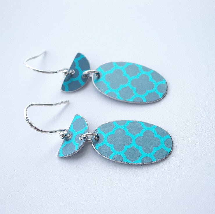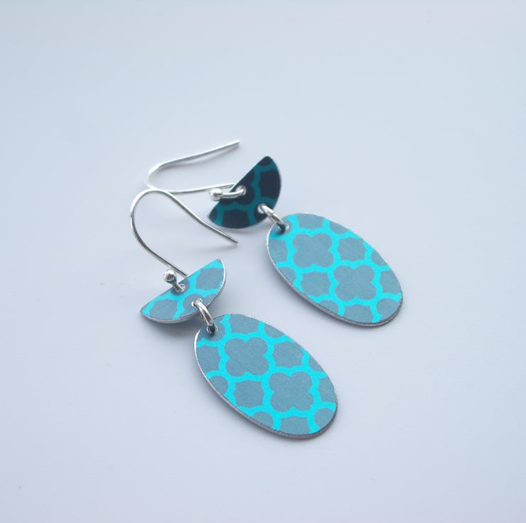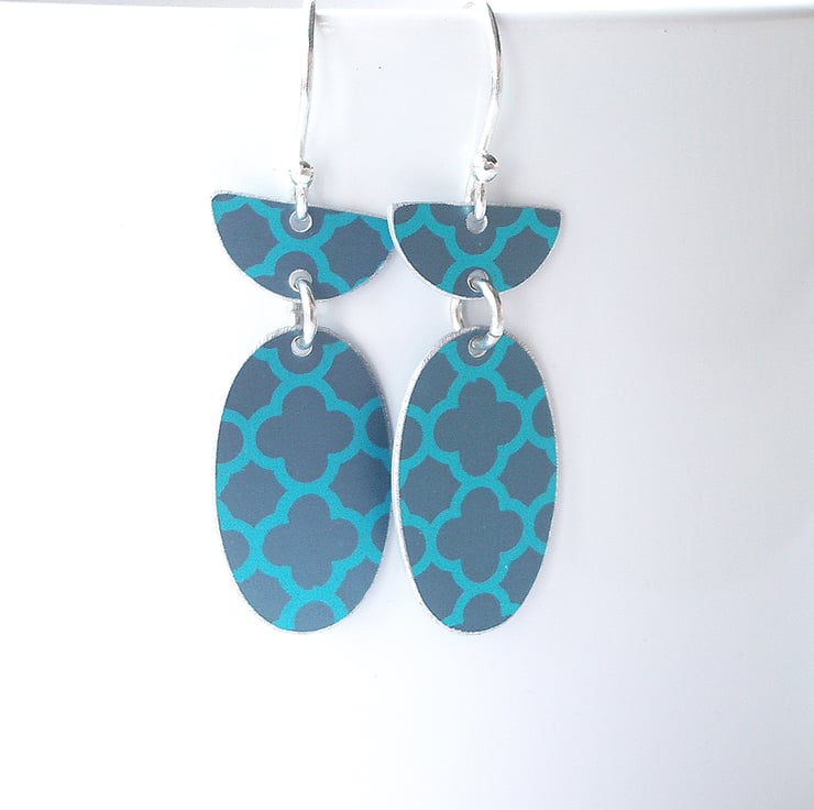 These lightweight unusual earrings are made from anodised aluminium which I have dyed in teal and then printed with a Moroccan tile style design. I cut the shapes using a jeweller’s saw and file the edges to give a nice smooth feel. They hang from sterling silver ear hooks and measure approximately 28mm x 13mm.
