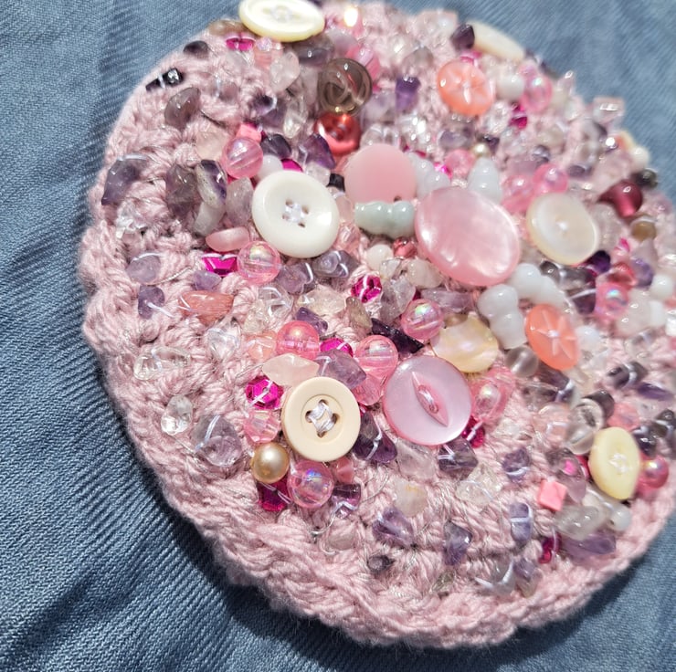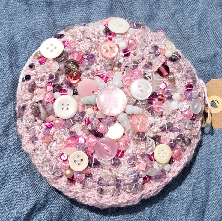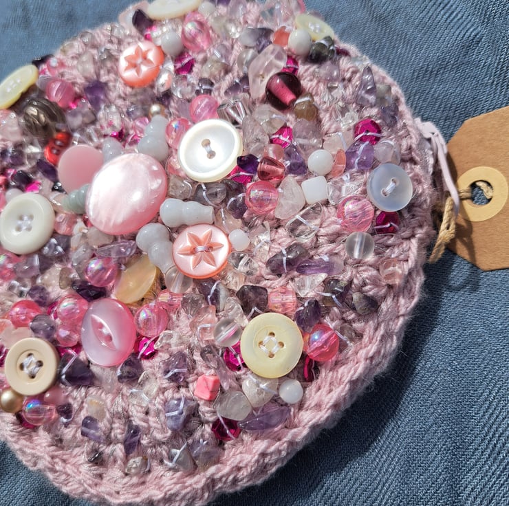 Beautiful crochet purse inspired by Glinda. Embellished with gemstones, beads and vintage buttons. Zip closure. Roughly 6inches across