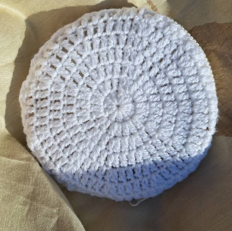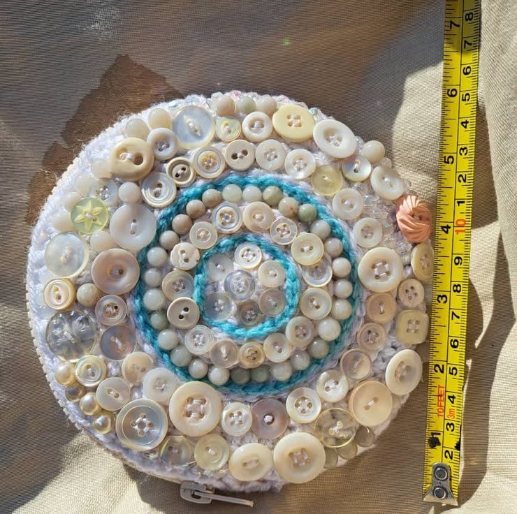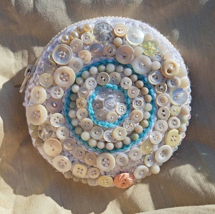Beautiful crochet purse inspired by bridal. Embellished with Jade gemstones, vintage buttons and beads. With added bue embroidery. Zip closure