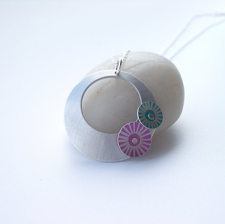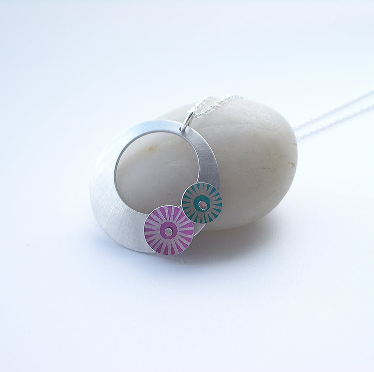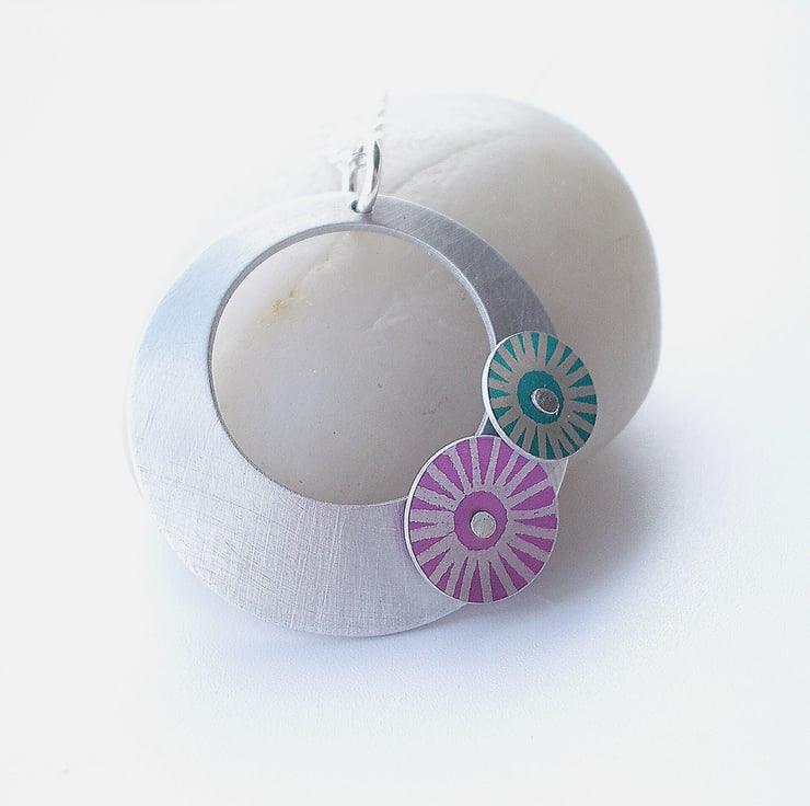 This simple circle pendant is made from aluminium which I have brushed to give a matt look. I cut out the circle by hand and dome it slightly adding two hand made riveted starburst print discs in pink and turquoise.
