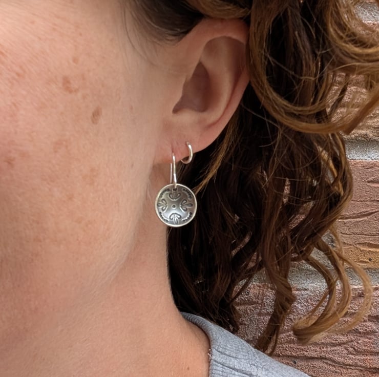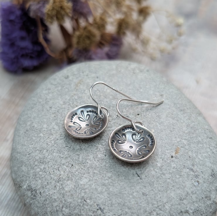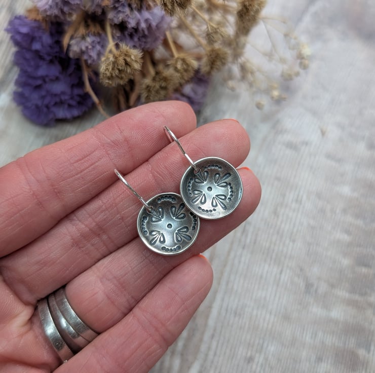 Beautiful silver mandala dome disc earrings, hand made from recycled Sterling Silver using traditional silversmith techniques and given a matt oxidised finish.