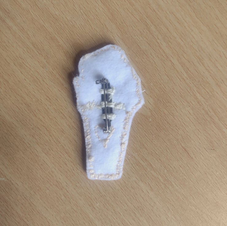 Backed with white felt and a locking brooch pin to attach to a jacket or other item of clothing or bag.