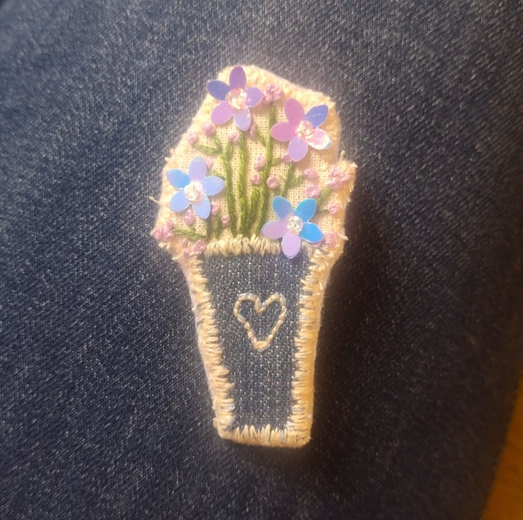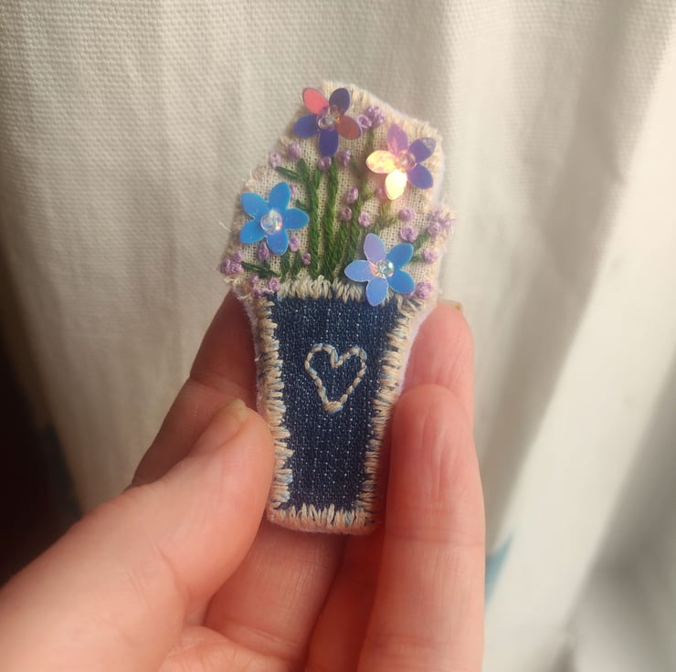 Hand-stitched vase of sequin flowers brooch pin, created with reclaimed denim, fabric and felt.