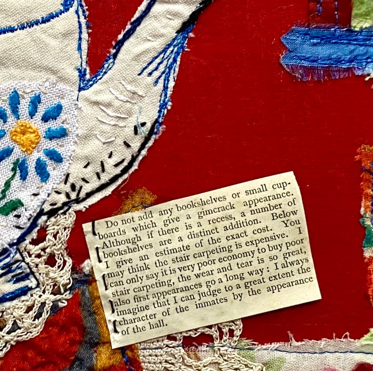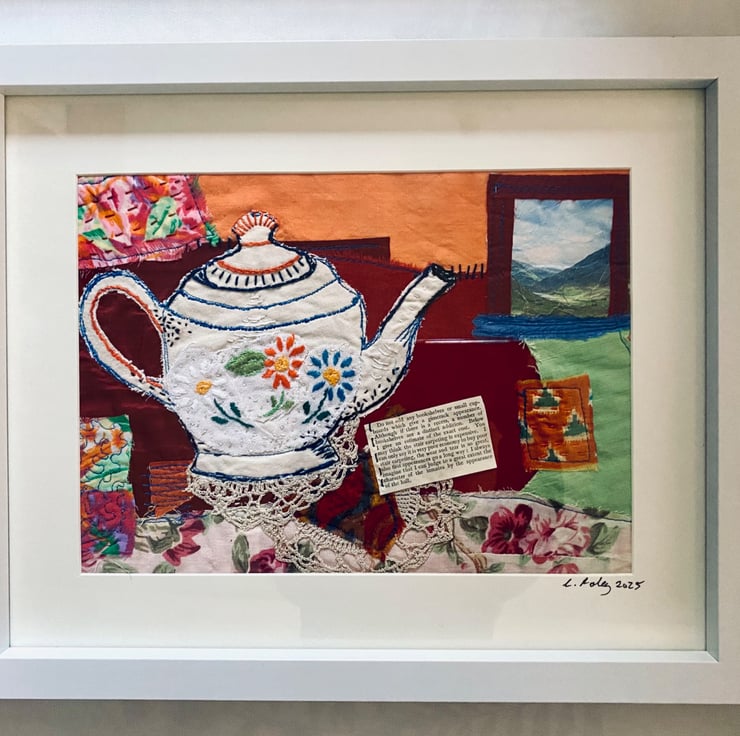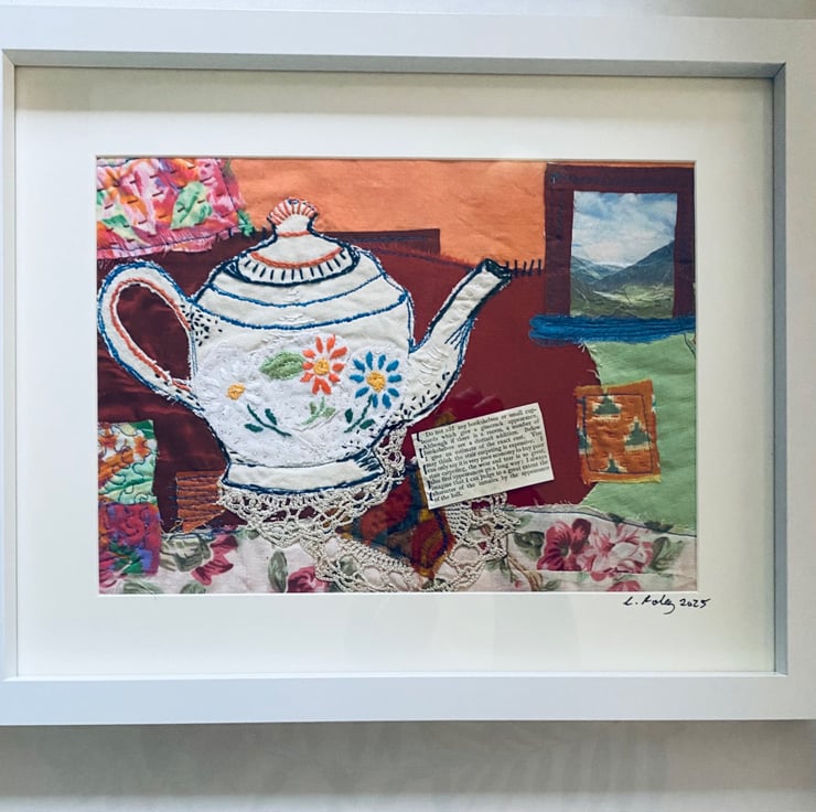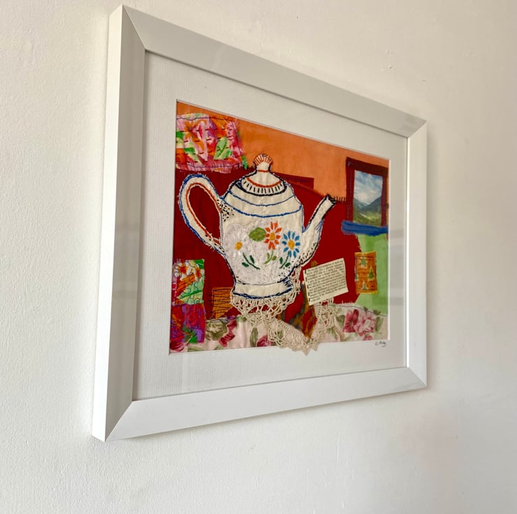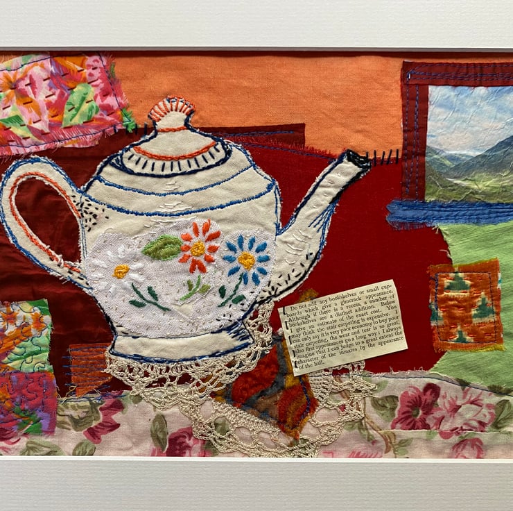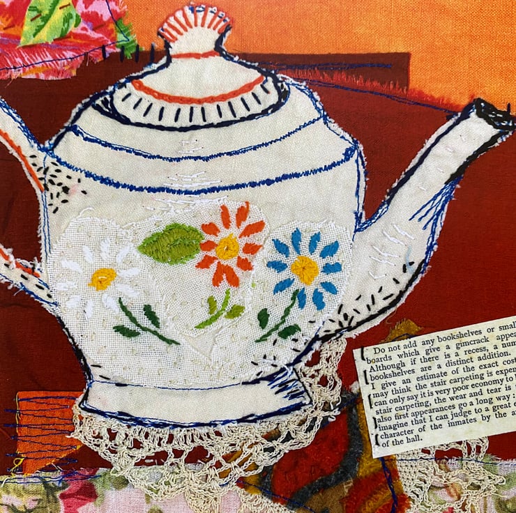 This collage features a vintage teapot and doily, it incorporates a Mountain View through the window and a snippet of print from a girls own annual circa 1898, which gives advice on how to dress your hall!!