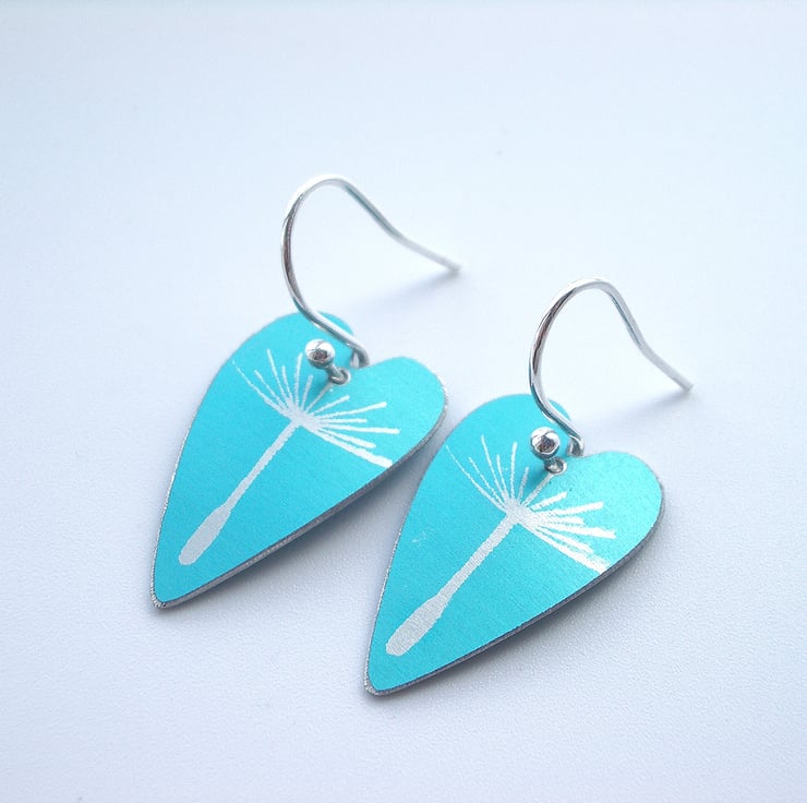 These dandelion seed heart earrings are made from aluminium which I have dyed in a turquoise colour adding a silver dandelion seed print. I then seal the dye so that it becomes a permanent part of the metal. I cut out the heart shapes by hand, using a piercing saw, then dome them so that they catch the light.