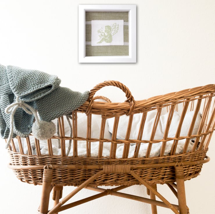 This handcrafted piece features a cross stitched fairy blowing a dandelion, created using green cotton thread.