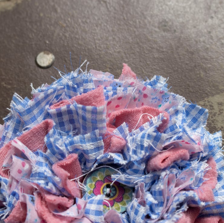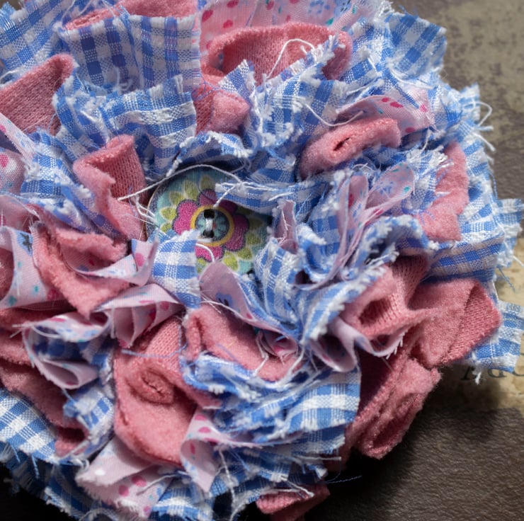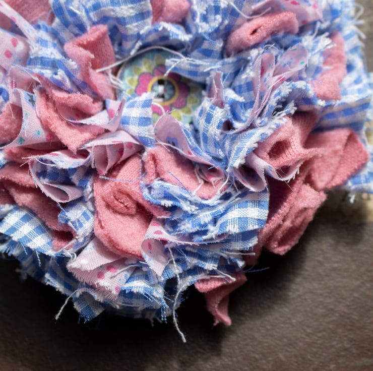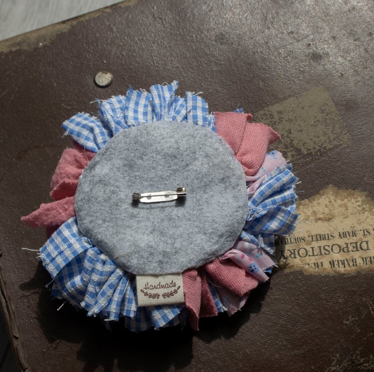 Add a charming touch of handcrafted elegance with this colourful blue and pink scrap fabric brooch. Designed in a vibrant flower style, each piece is uniquely assembled from repurposed textiles, making it one of a kind. No two are the same