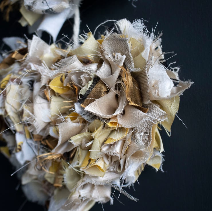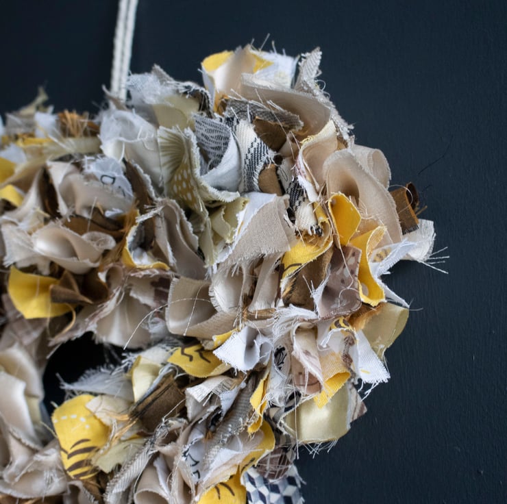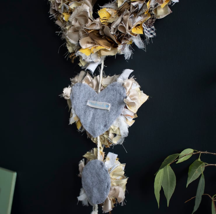 Please note that due to the use of unhemmed scrap fabric, some fraying and shedding will occur over time, adding to the textured, rustic charm of the wreath. This wreath includes fabric that sheds a little more, this is normal but please be aware of this. These creations are designed for indoor use. If you'd like to hang it on an outdoor door, we recommend placing it in a sheltered spot to protect its beauty.